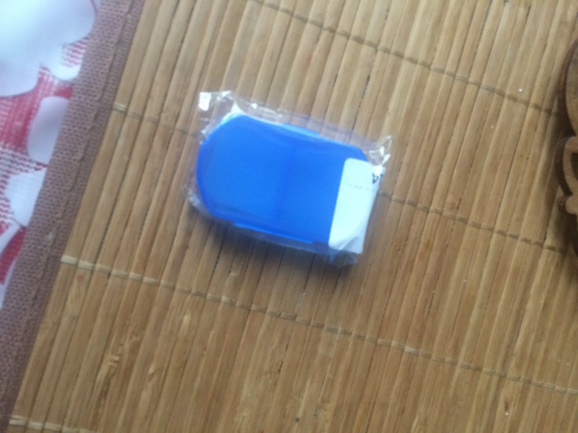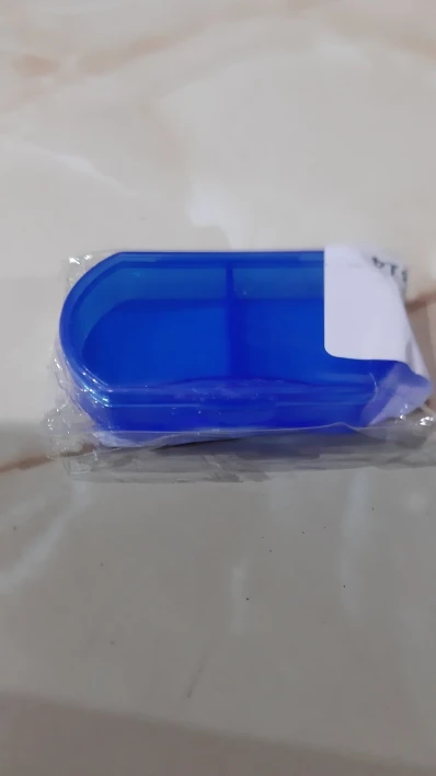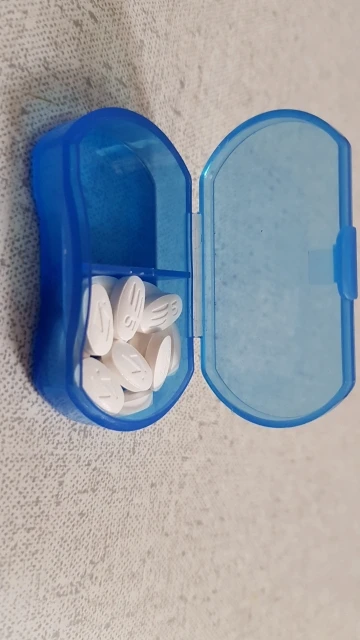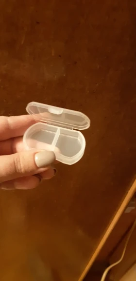 Таблетница пришла за 3 недели. В синем цвете, размеры 5,8х3,5 см