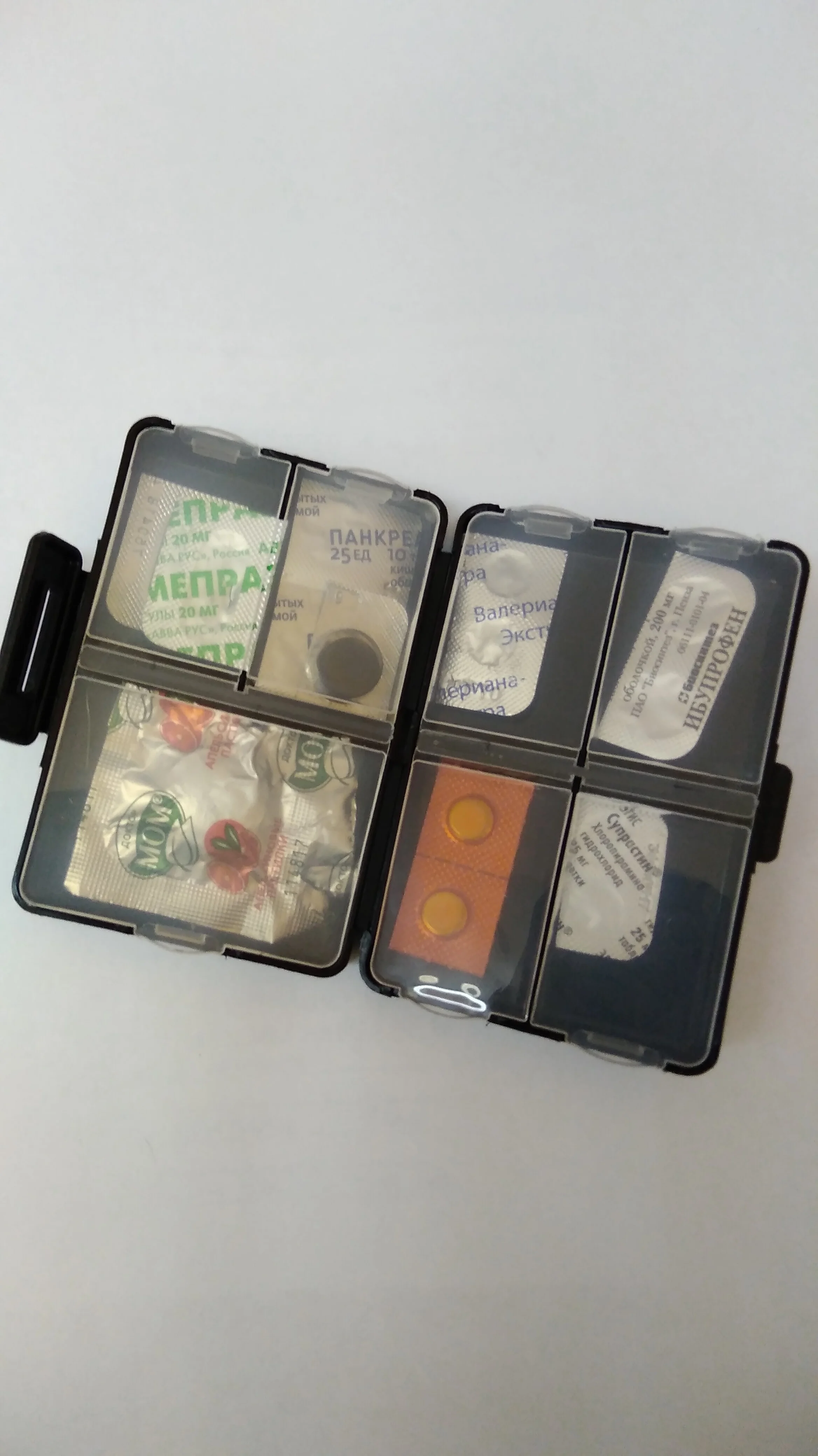 Будьте внимательны при заказе: оказывается, присылают контейнеры "случайных цветов", т.е. не как на картинке. Мне вот пришёл чёрный. Не очень симпатично, ну да ладно. Отсеки закрываются на очень тугие защёлки - испытание для ногтей. А так - очень удобно, вмещает минимальный набор экстренных препаратов на одного человека.