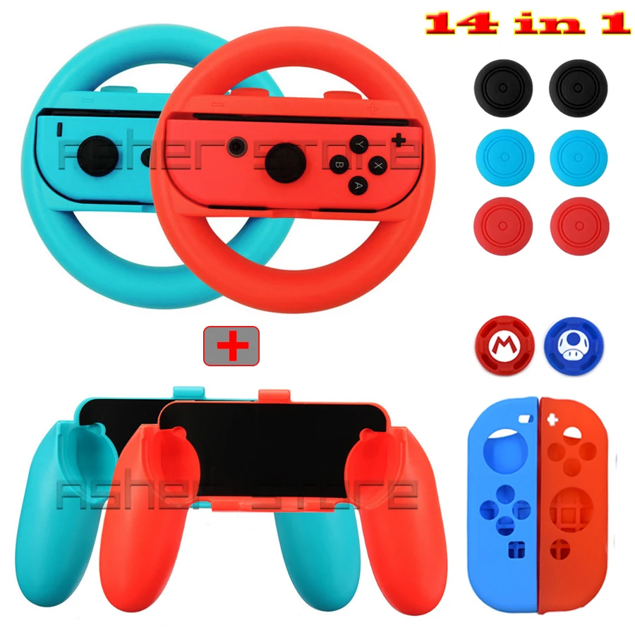Посылка в комплекте 14 в 1 включает в себя:1 пара колес + 1 пара ручек + 8 силиконовых аналоговых колпачков + 1 пара Силиконовый чехол для переключателя Joy-con