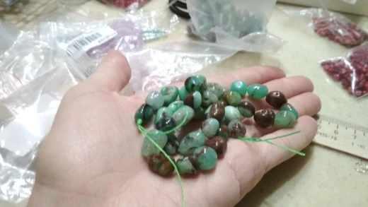 заказывала две нити бус, на одной нити бусины были крупнее, но хуже качество, многовато коричневых, хотелось бы, чтобы было больше зеленых. На другой нити бусины были получше качеством, но мельче.