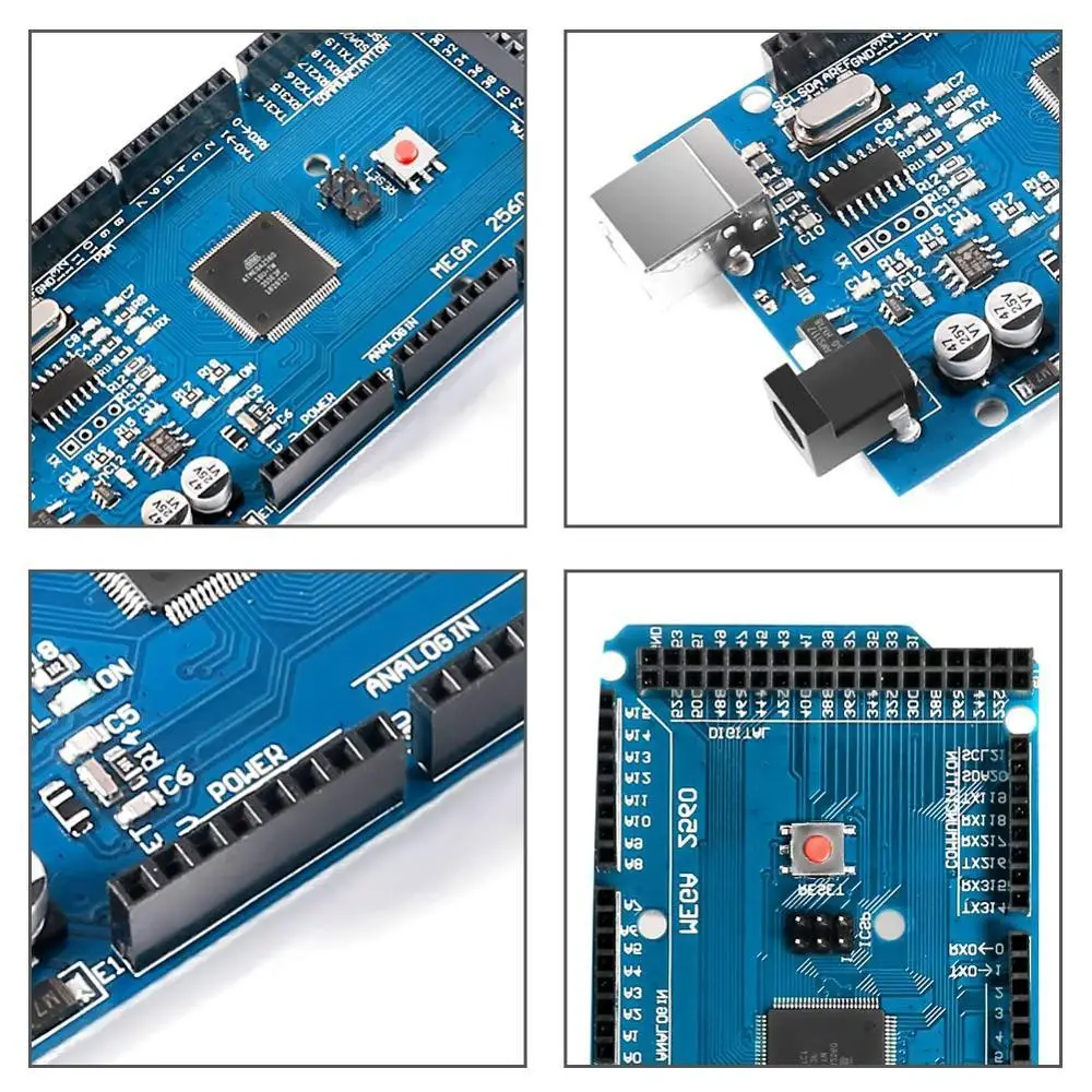 • Плата mega 2560 R3 содержит все необходимое для поддержки микроконтроллера; просто подключите его к компьютеру с помощью бонусного usb-кабеля или включите его с адаптером переменного тока в постоянный ток или батареей, чтобы начать работу. Источник питания выбирается автоматически.