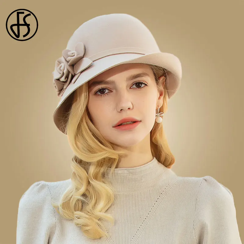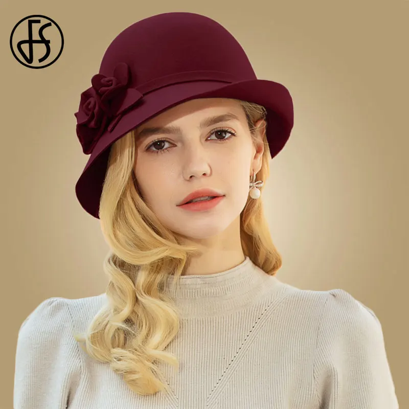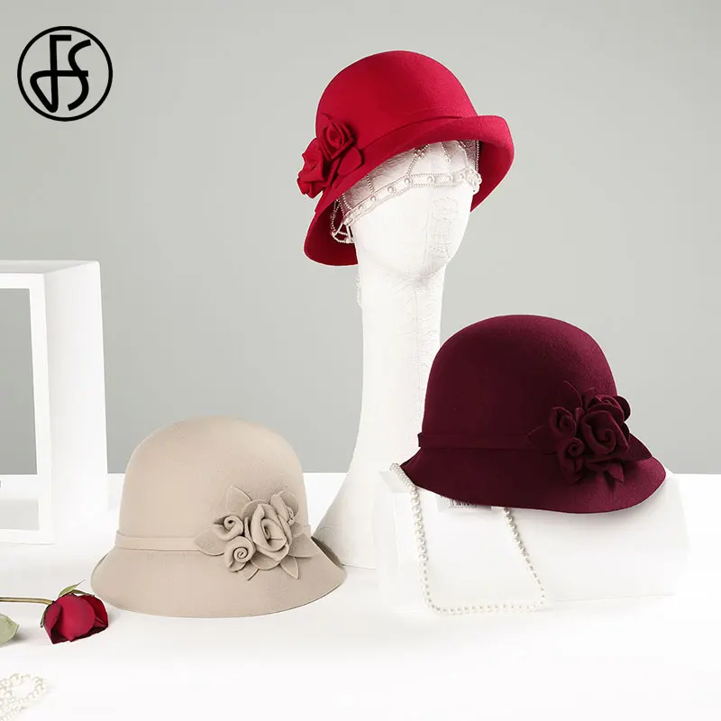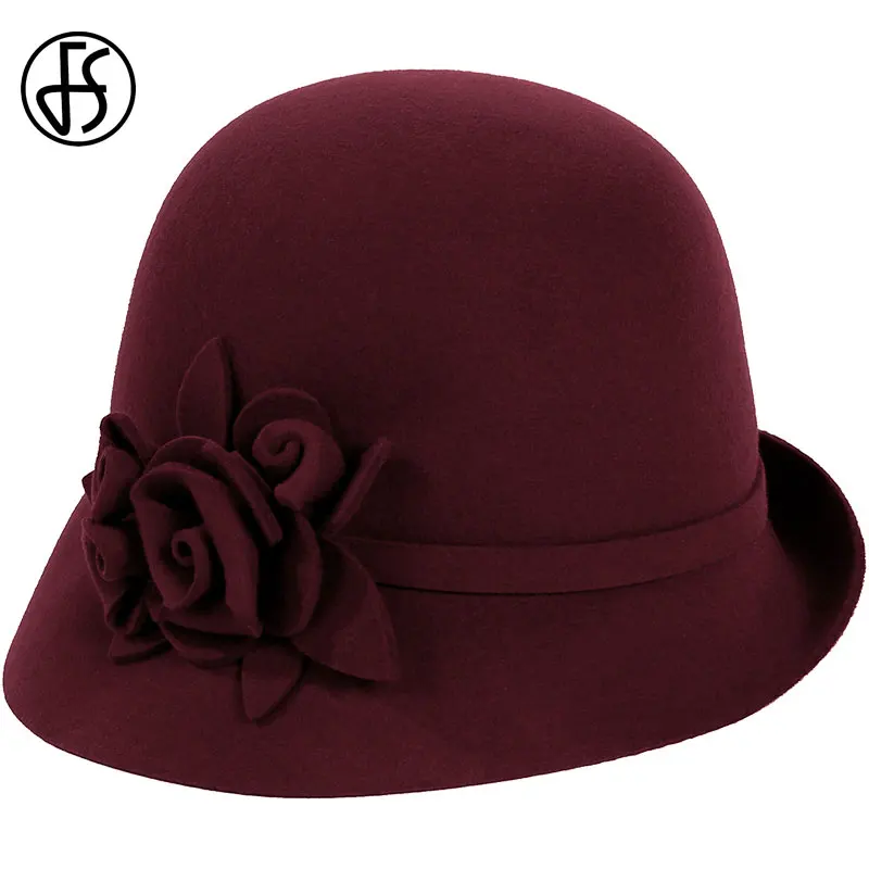 FS 100% австралийская шерстяная шляпка для женщин с широкими полями и черными красными цветами, зима-осень, фетровая Шляпа Дерби