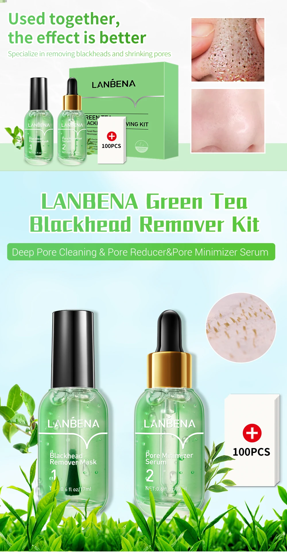 Используется вместе, эффект лучше специализируется на удалении черных точек и усадке пор LANBENA, набор для удаления черных точек зеленого чая, глубокое очищение пор, восстановитель пор, минимайзер сыворотки