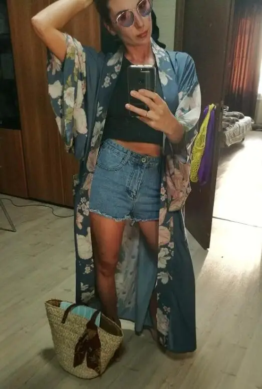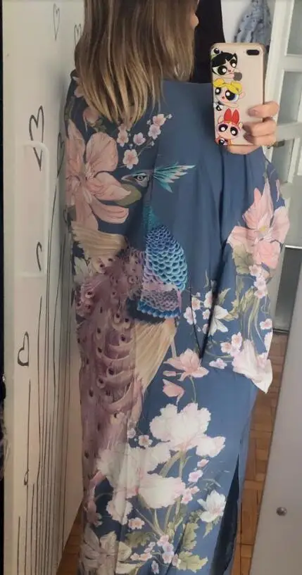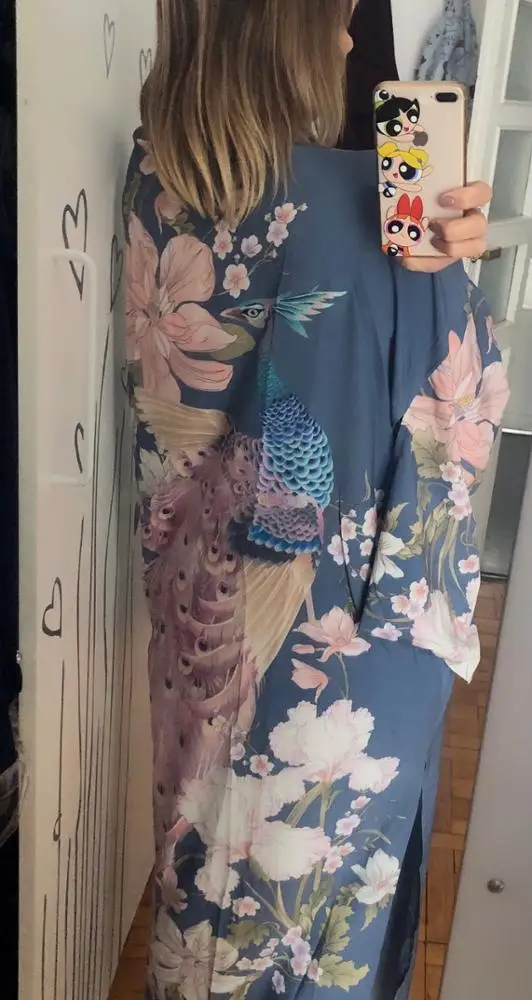 Длинное кимоно с цветочным принтом павлина, с V-образным вырезом, в этническом стиле, на завязках, кардиган свободного кроя, 2019