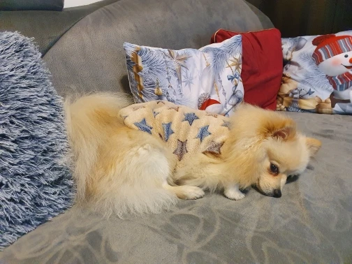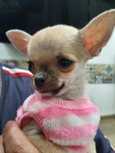 Очень хорошенькая кофточка, но на чихуахуа весом 2-2.5 кг можно взять на размер больше.