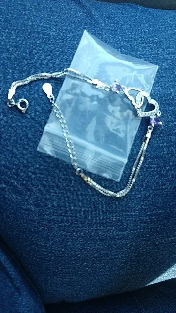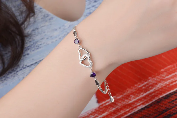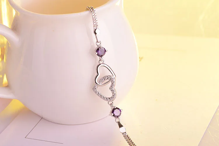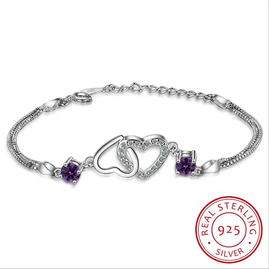 Женский браслет из серебра 925 пробы, с двойным сердцем и фиолетовыми фианитами