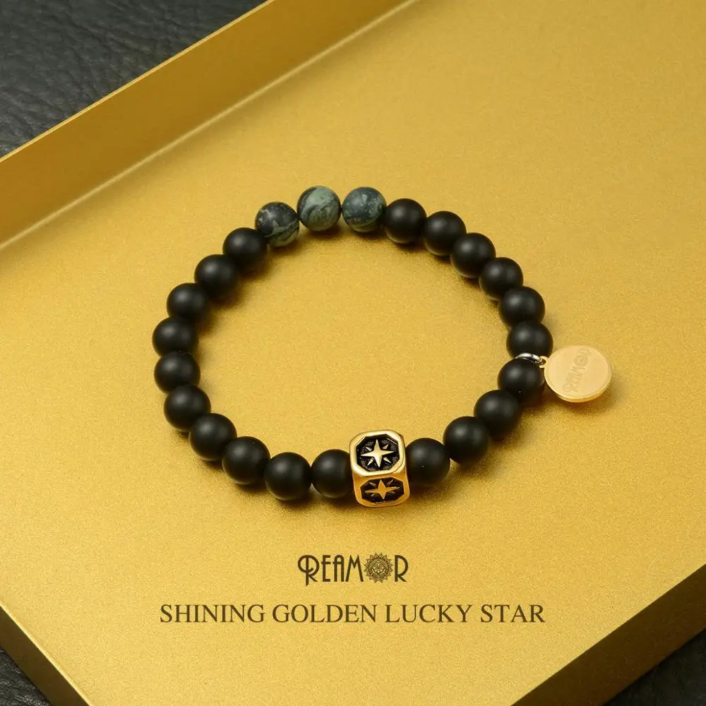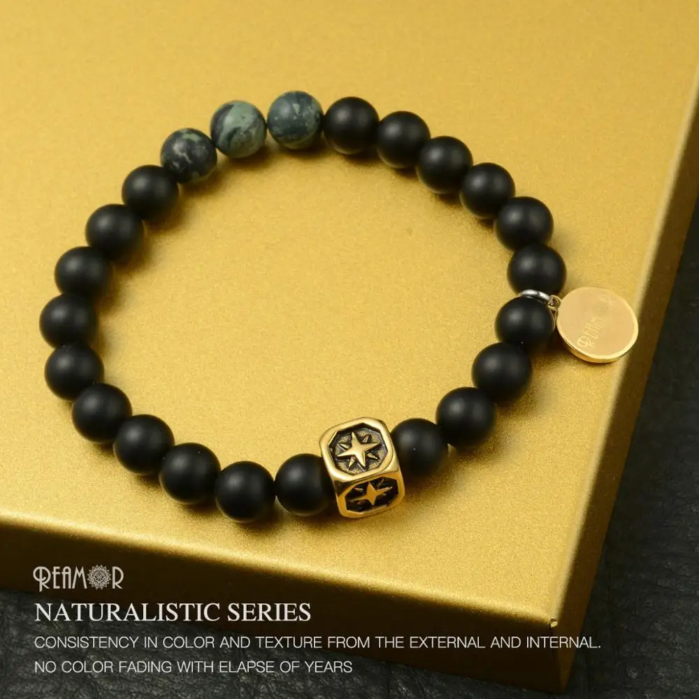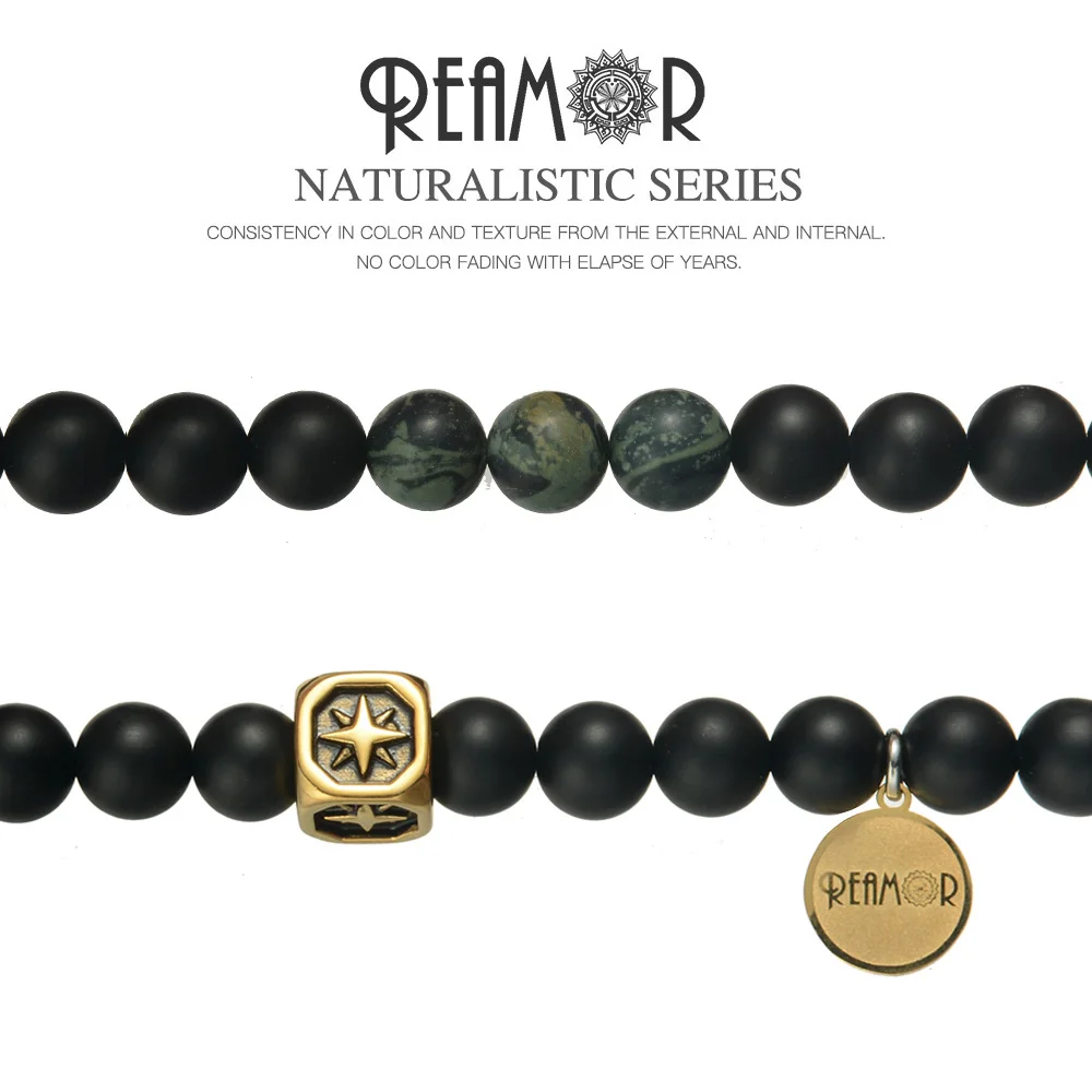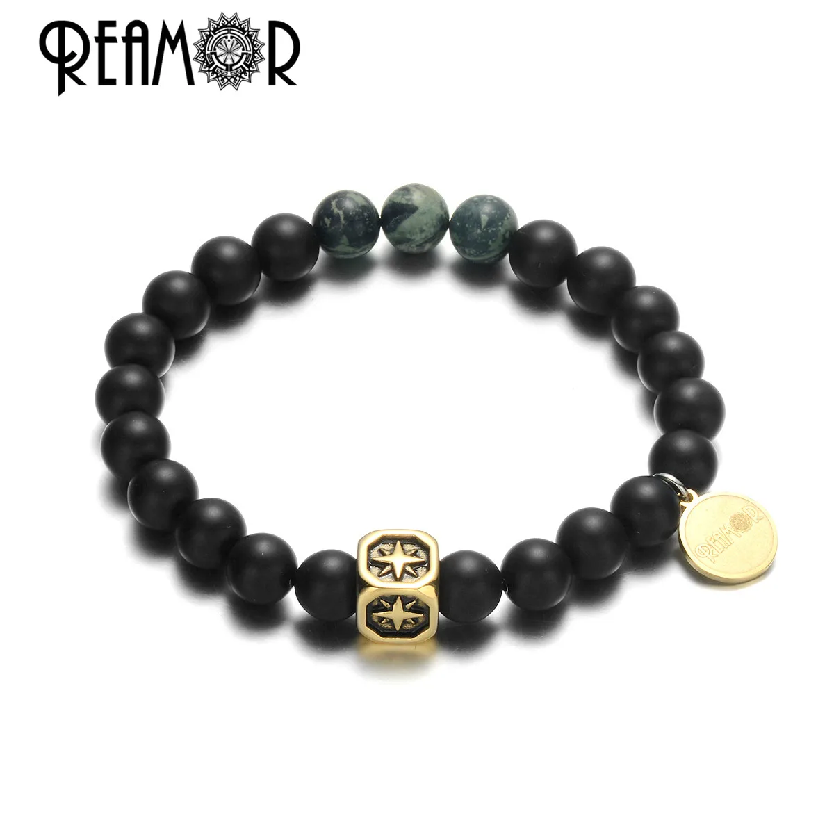 Браслет REAMOR из натурального камня, 8 мм, браслет из нержавеющей стали с Блестящими Золотыми звездочками, браслеты с бисером для мужчин и женщин, ювелирные изделия