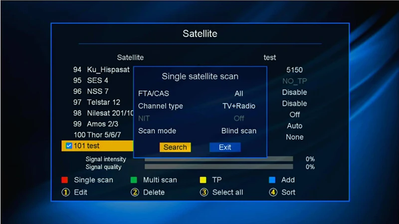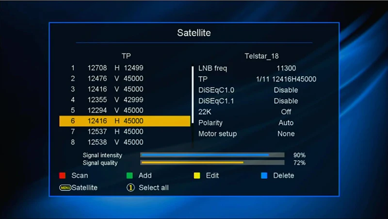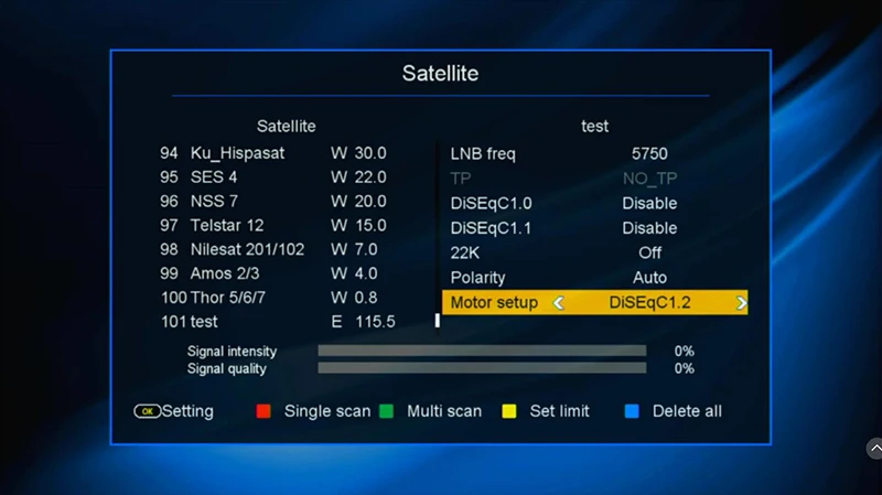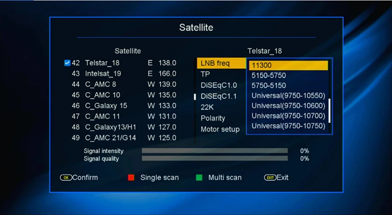 После входа в Спутниковое меню, как показано на рисунке:A. Слева находится список спутников, справа-токПараметры спутника.Ниже приведены следующие функциональные клавиши:1> нажмите красную кнопку, чтобы войти в «поисковую платформу с одной звездой»Интерфейс2> Нажмите Зеленую кнопку, чтобы войти в интерфейс меню «multi»Станция спутникового поиска "(для выбора нескольких спутников)3> нажмите желтую кнопку, чтобы войти в интерфейс «Список TP»4> нажмите синюю кнопку, чтобы войти в интерфейс меню «Добавить спутник».Чтобы добавить имя спутника и долготу5> нажмите «1», чтобы войти в интерфейс «Редактировать спутник», где вы можетеРедактирование имени спутника и долготы6> нажмите «2», чтобы войти в интерфейс «удалить спутник»7> нажмите «3», чтобы выбрать все спутники8> нажмите «4», чтобы сортировать список спутников9> нажмите «OK», чтобы «выбрать» текущий спутникB. Введите интерфейс «Настройки антенны», как показано на рисунке:Параметры следующие:Локальный генератор: Нажмите кнопку OK, чтобы выбрать параметр вВыпадающий список напрямую.Транспондер: нажмите клавиши «влево и вправо», чтобы выбратьТранспондер, и нажмите кнопку «OK», чтобы выбрать транспондер вВыпадающий список.Diseqc1.0: нажмите «влево и вправо» для переключения, нажмите «OK» для отображенияПараметры в выпадающем списке (отключить, порт 1, порт 2, порт 3,Порт 4) который можно напрямую выбрать.Diseqc1.1: нажмите клавиши «влево и вправо», чтобы переключиться, нажмите «OK»Ключ для отображения опций в выпадающем списке (больше опций),Который можно напрямую выбрать.22K: нажмите кнопку «влево и вправо», чтобы выбрать «Выкл/ВКЛ». Обратите внимание, чтоКогда локальная частота «Универсальная» и «однородная», 22K неНеобязательно и недопустимо.Полярность: нажмите клавиши «влево и вправо», чтобы переключить другую полярность"Авто/ч/в".В нижней части интерфейса есть две функциональные клавиши:.Красный ключ: Войдите в интерфейс поисковой платформы с одной звездой.Зеленая кнопка: Войдите в интерфейс многоспутникового поиска.После того, как будут установлены все вышеуказанные параметры, вы можете выбрать одинСтанция спутникового поиска и выберите «Пуск», как показано на рисунке: