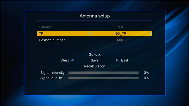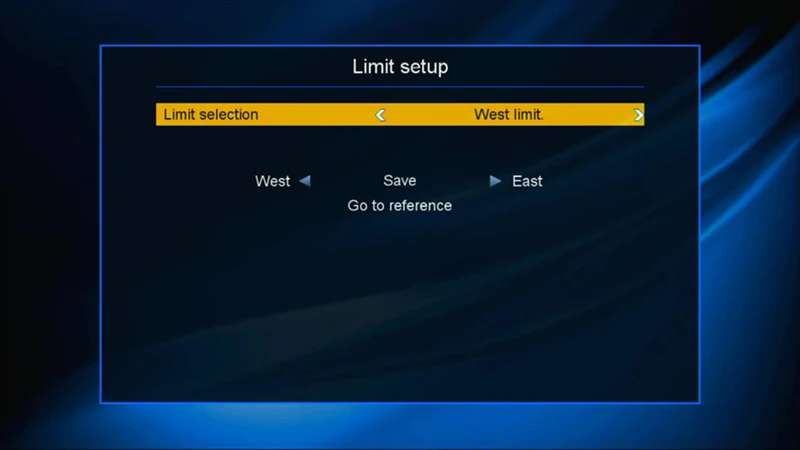 В интерфейсе «Список спутников» Выберите любой спутник, нажмитеКлавиша «SAT», отредактируйте долготу спутника как долготуМесто назначения, а затем введите «Настройки антенны»Интерфейс, как показано на рисунке:Параметры интерфейса следующие:Локальная частота: нажмите кнопку «влево и вправо», чтобы переключить «локальная»Частота ".Тип переводного горшка: нажмите «слева и справа», чтобы переключиться междуUSALS / diseqc1.2.Локальная Долгота: когда тип поворотного горшка USALS, нажмитеЦифра ключа для установки местной долготы. Когда тип поворотного горшкаDiseqc1.2, этот товар не является необязательным.Локальная широта: когда тип передачи USALS, нажмитеКлавиша Номера для установки локальной широты. Когда это diseqc1.2, этоВариант не является обязательным.Удалить все: когда Тип переводного горшка diseqc1.2, удалить наборПоложение спутника. Когда Тип переводного горшка используется, этот товарНе является обязательным.Настройка передачи: Если тип передачи diseqc1.2, вам нужноРучная регулировка положения передачи для входа в передачуИнтерфейс настройки, как показано на рисунке:Параметры интерфейса следующие:Спутник: Нажмите левую и правую клавиши, чтобы выбрать спутникИмя.Транспондер: Нажмите левую и правую клавиши, чтобы выбратьТранспондер, или нажмите кнопку OK, чтобы напрямую выбратьТранспондер в выпадающем списке.Положение: Установите положение, чтобы сохранить вращение вращающегося сковороды.Когда Тип транспортной кастрюли USALS, Он рассчитываетсяАвтоматически и не требует настройки вручную.Настройка предела: Войдите в интерфейс настройки предела, как показано вРисунок:Параметры интерфейса следующие:Настройка ограничения: Нажмите левую и правую клавиши, чтобы переключаться между"Отключить предел, Запад лимит и восток лимит".Три настройки могут работать в соответствии с интерфейсомДисплей.После настройки нажмите кнопку выхода, чтобы вернуться к «настройкам антенны»Интерфейс, выберите одну звезду или триггер поиска, а затем поискМожно начать.Конечно, когда Тип поворота USALS, вы можете напрямую ВойтиЭтап поиска, и сковорода автоматически перейдет кМесто назначения, а затем начните поиск.