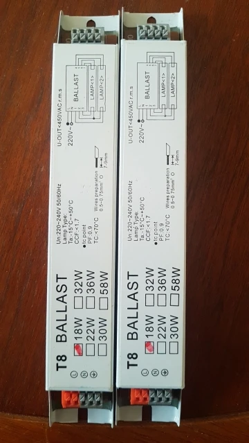 Продукт работает. Это двойной балласт, я пробовал только с одной трубкой 18 Вт, и он работает. Это, скорее всего, мгновенный Запуск электрического балласта. Без мерцания, без жужания.