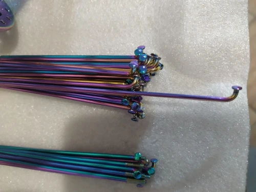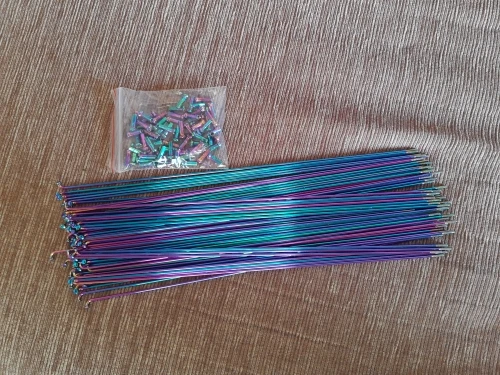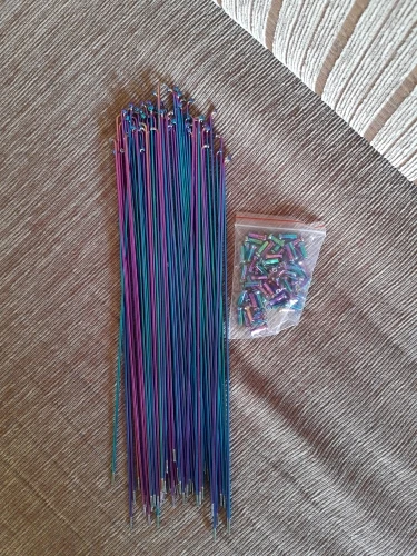 заказывал на два колеса, выглядят очень круто. толщина 2.0. есть не большие дефекты в виде облезлых спиц, но так в целом отлично. колпачки такого же цвета как и спицы. резьба у колпачков на некоторых тугая. в посылке положили с запасом на 2 колпачка больше, спиц ровное колличество.