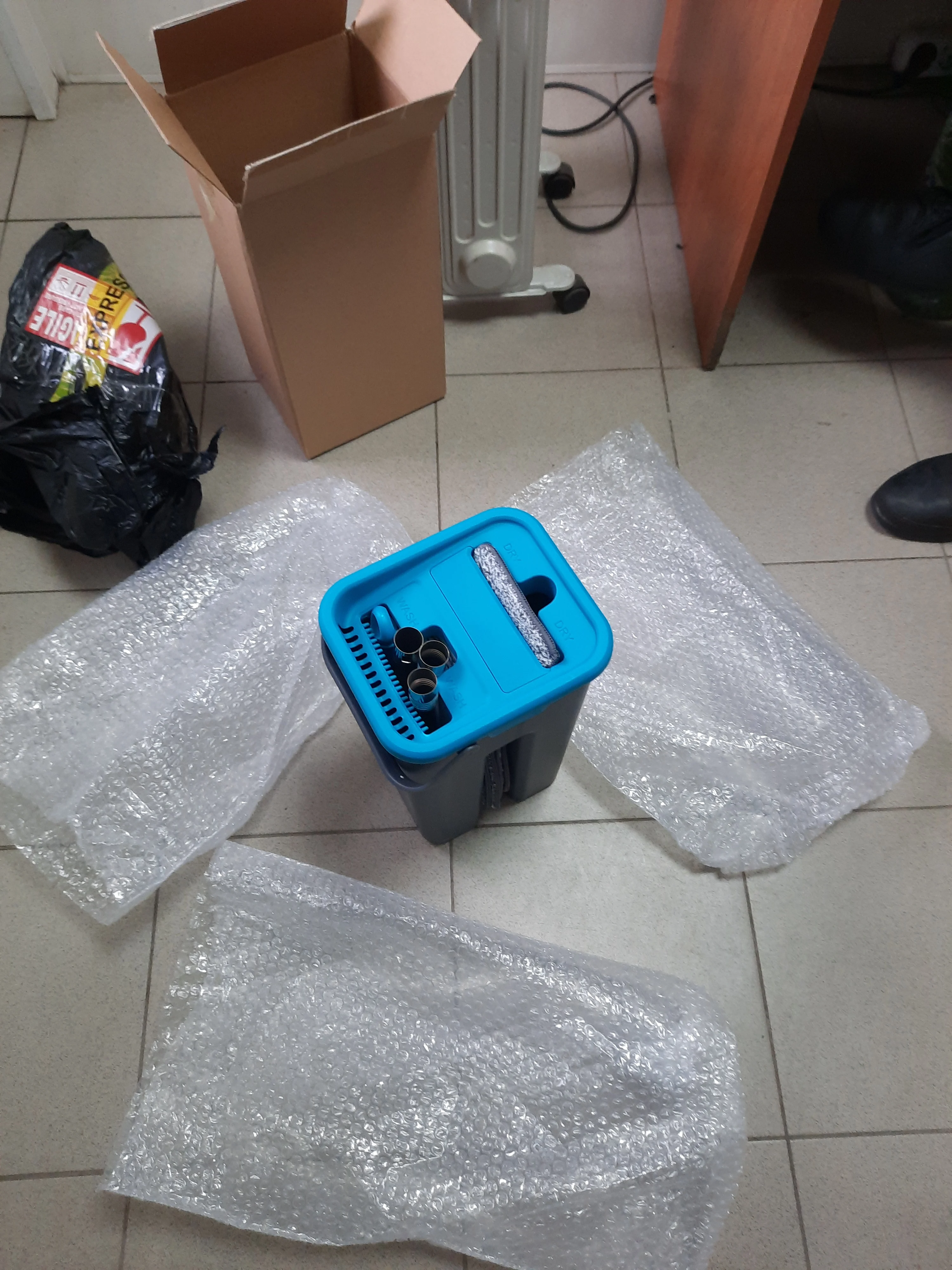 Супер быстрая доставка! Заказ приехал за неделю (Флорида). Покупала ради ведра, а моя швабра в него не влезла. Швабра в комплекте нормальная, высокая, состоит из нескольких металлических частей, которые скучиваются между собой. Периодически во время уборки они раскручивались, приходилось отвлекаться и фиксировать. В остальном 10/10, рекомендую! Ведро компактное, собирается/разбирается очень легко. На фото поставила рядом обычное ведро для сравнения. Ручка специально сбоку, чтобы когда ведро полное, то центр тяжести не смещался. Удобно регулировать степень отжимания швабры. Если хочется посуше, надо опустить ее несколько раз. Для того, чтобы убрать излишки воды, достаточно опустить швабру в сухой отсек один-два раза. Пока пользовалась только один раз, посмотрим, на сколько её хватит. С продавцом не общалась.