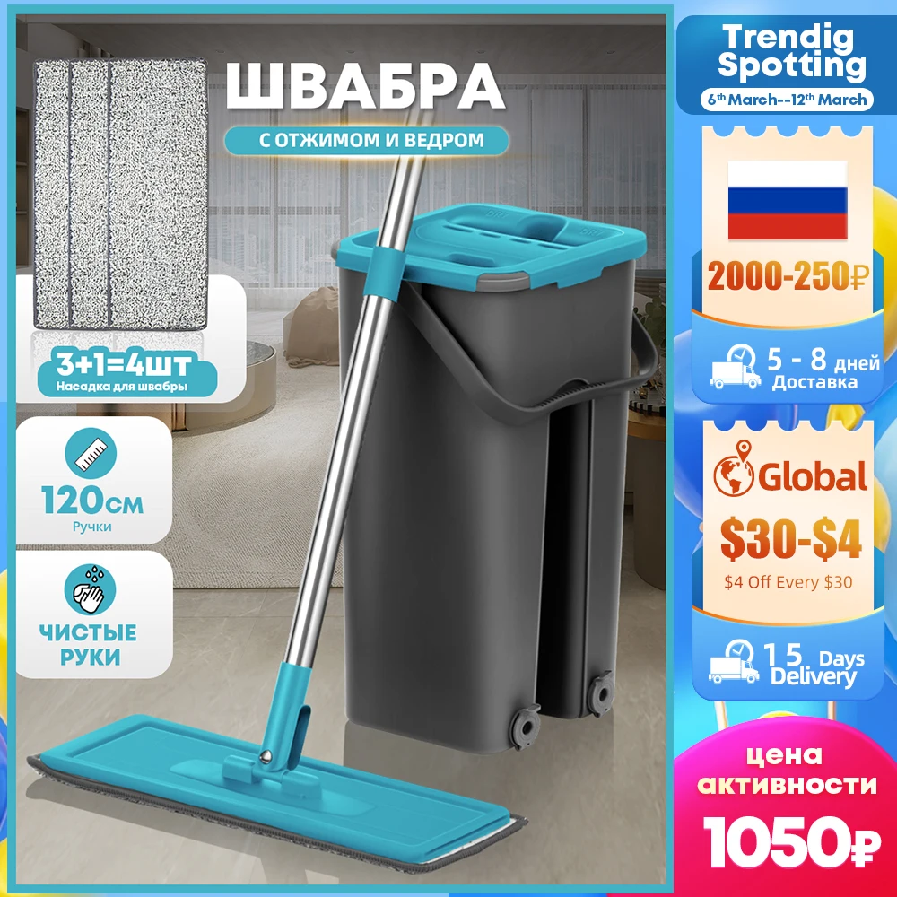 Плоская швабра с ведром отжимом без рук, устройство для сухой и влажной уборки с ведром, для ламината из твердой древесины,швабра для мытья полов