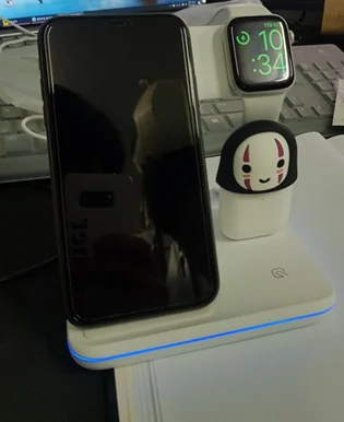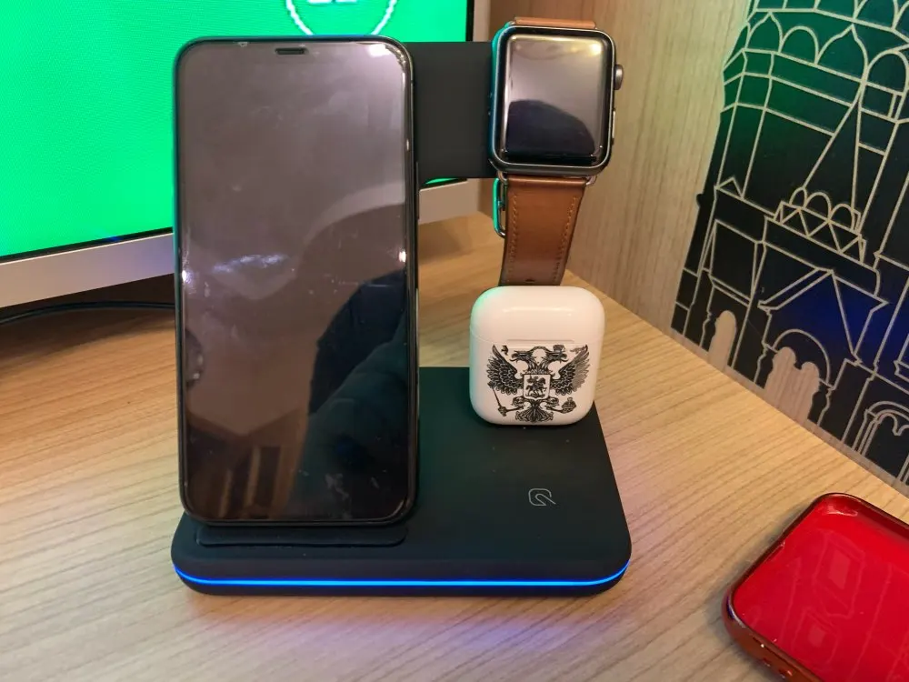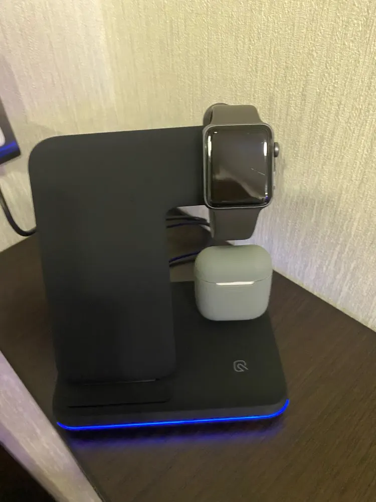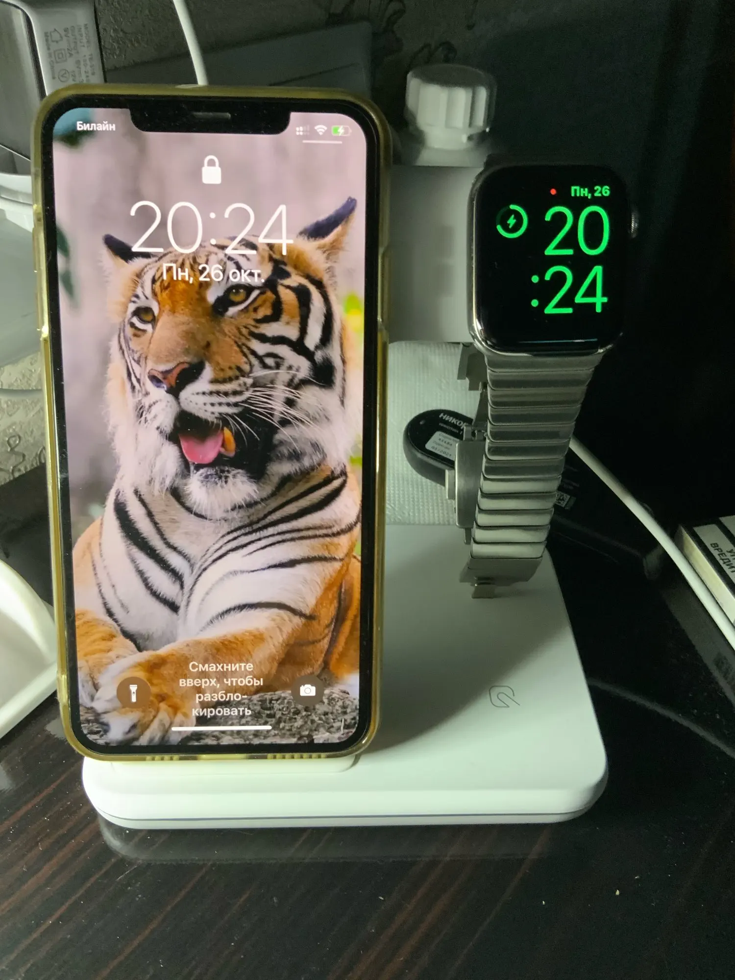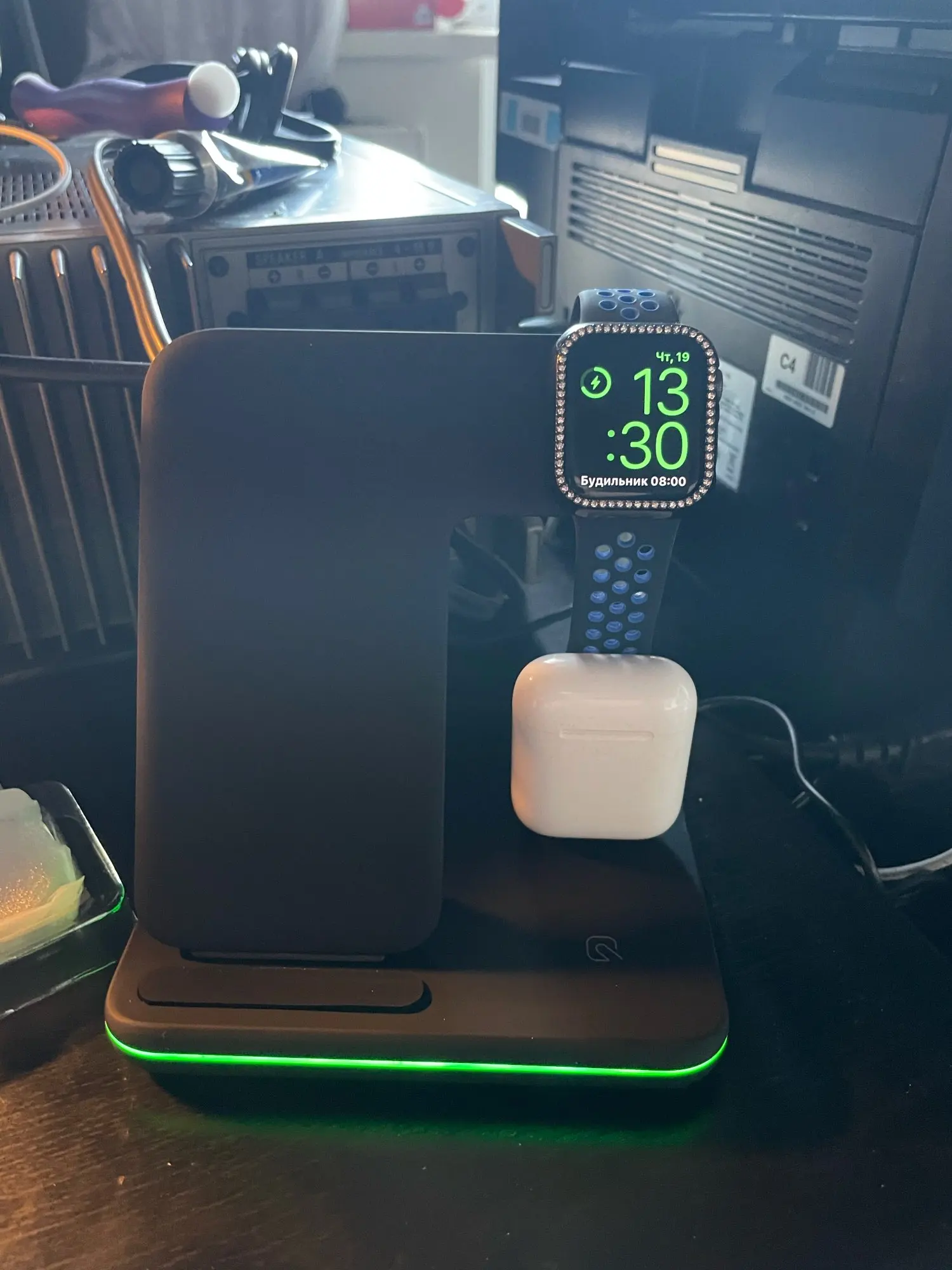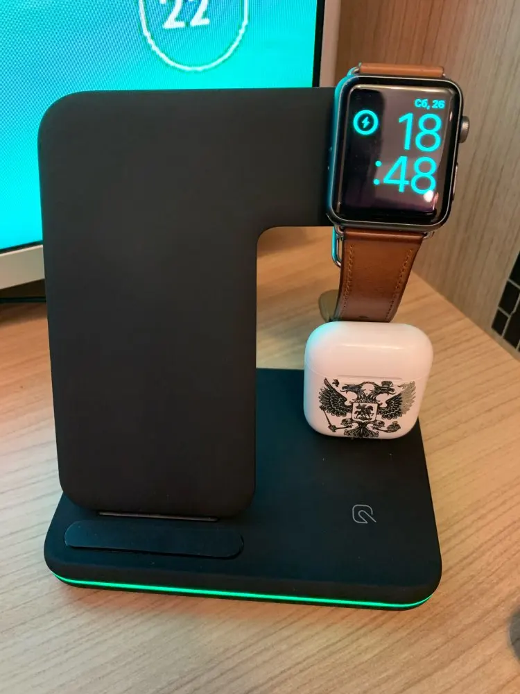 Выглядит очень лаконично и стильно! Заряжает телефон и часы отлично, но AirPods через силиконовой чехол почему-то не заряжает, видимо контактно не доходит. Без него даже не пробовал, а снимать постоянно чехол совсем неудобно, за что звезду одну убрал. В целом для телефона и часов рекомендую!