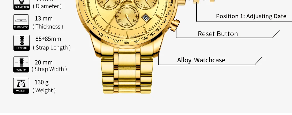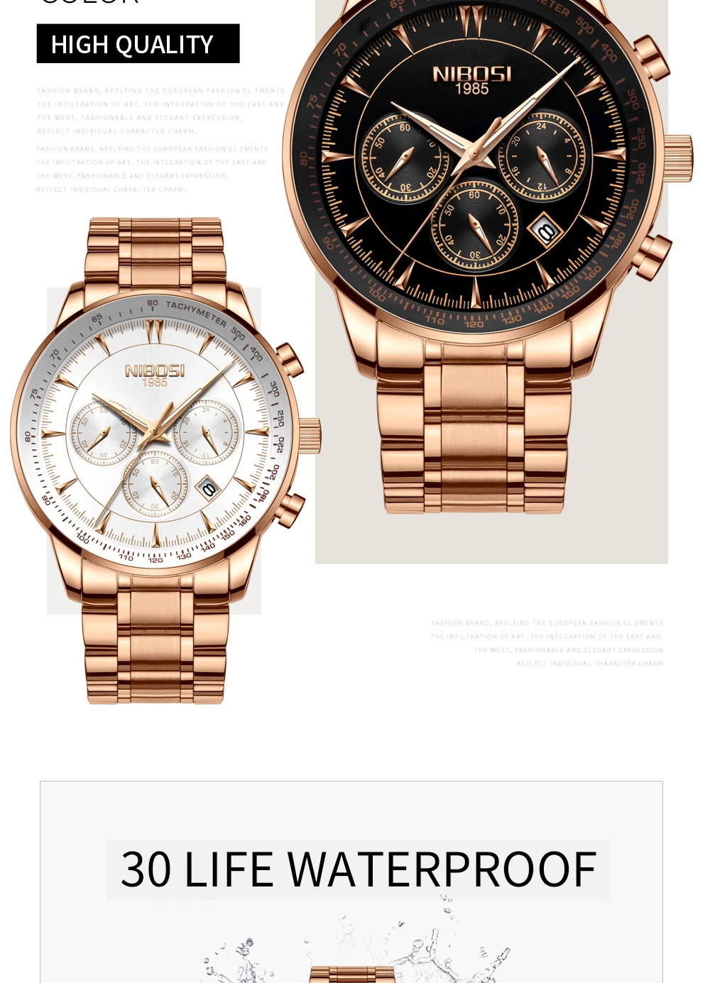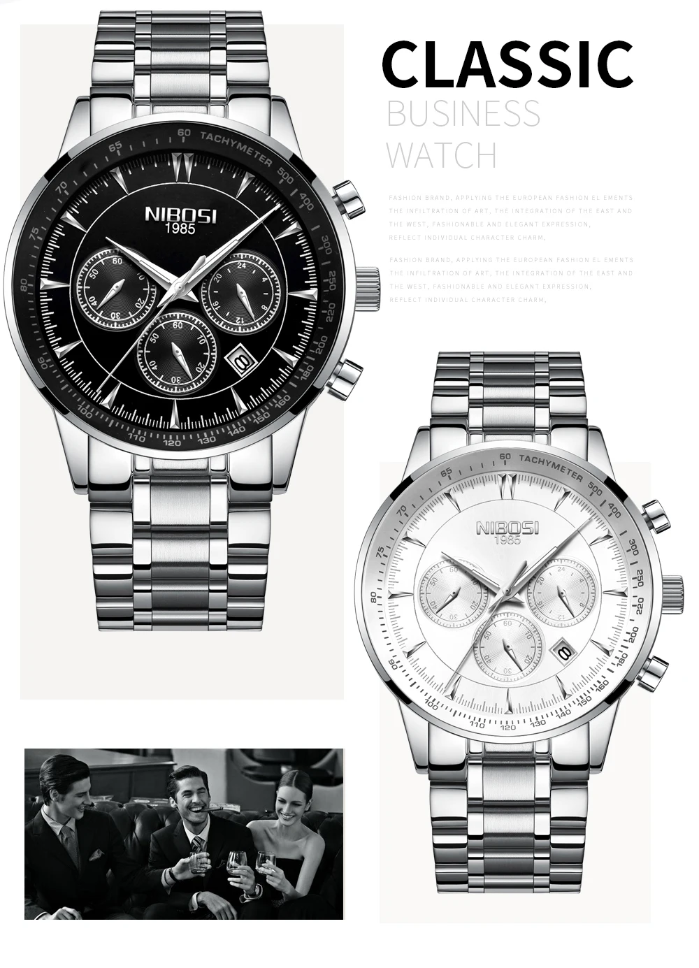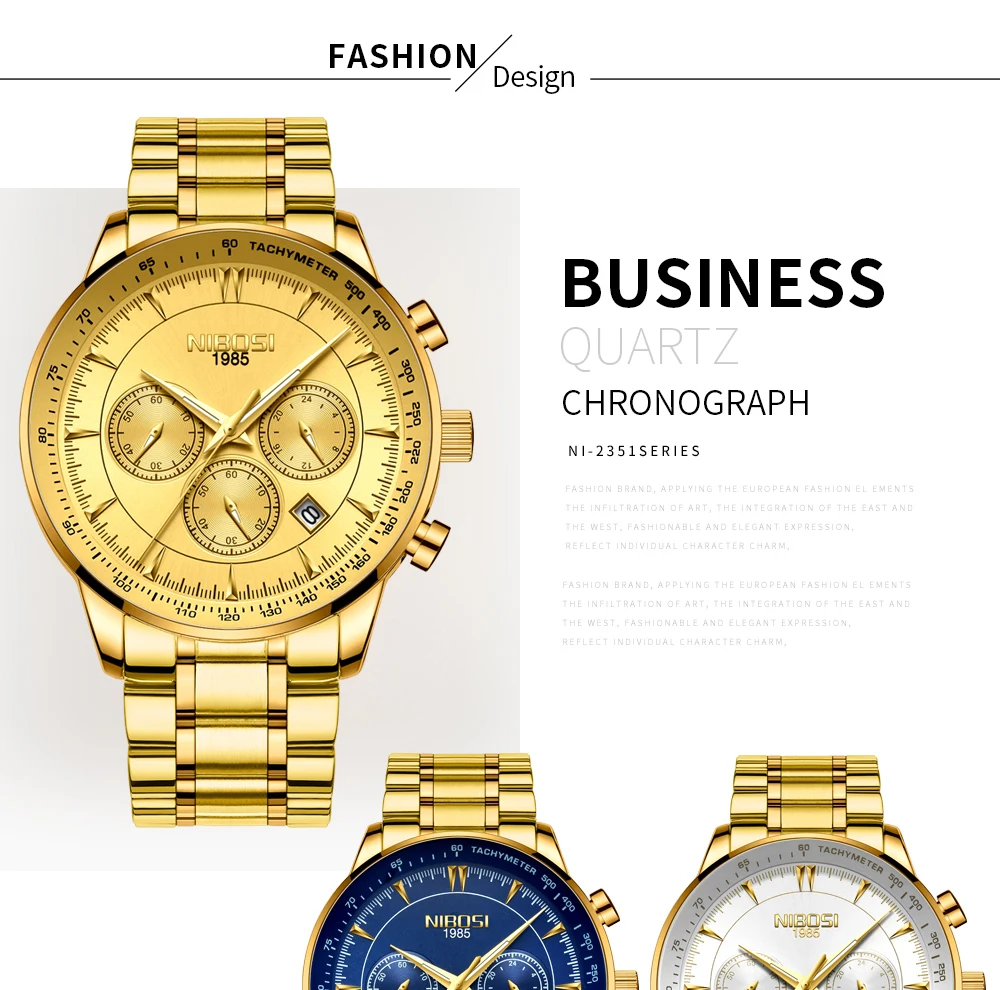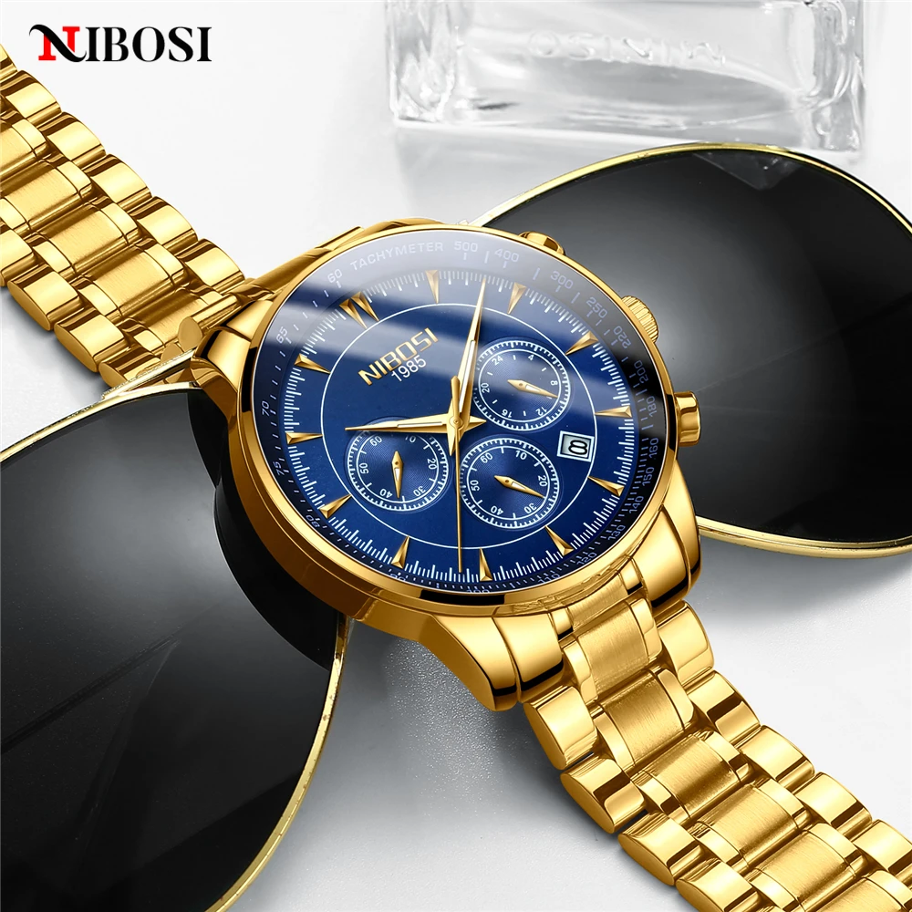 Часы наручные NIBOSI Мужские кварцевые, роскошные модные брендовые золотистые деловые водонепроницаемые спортивные с хронографом