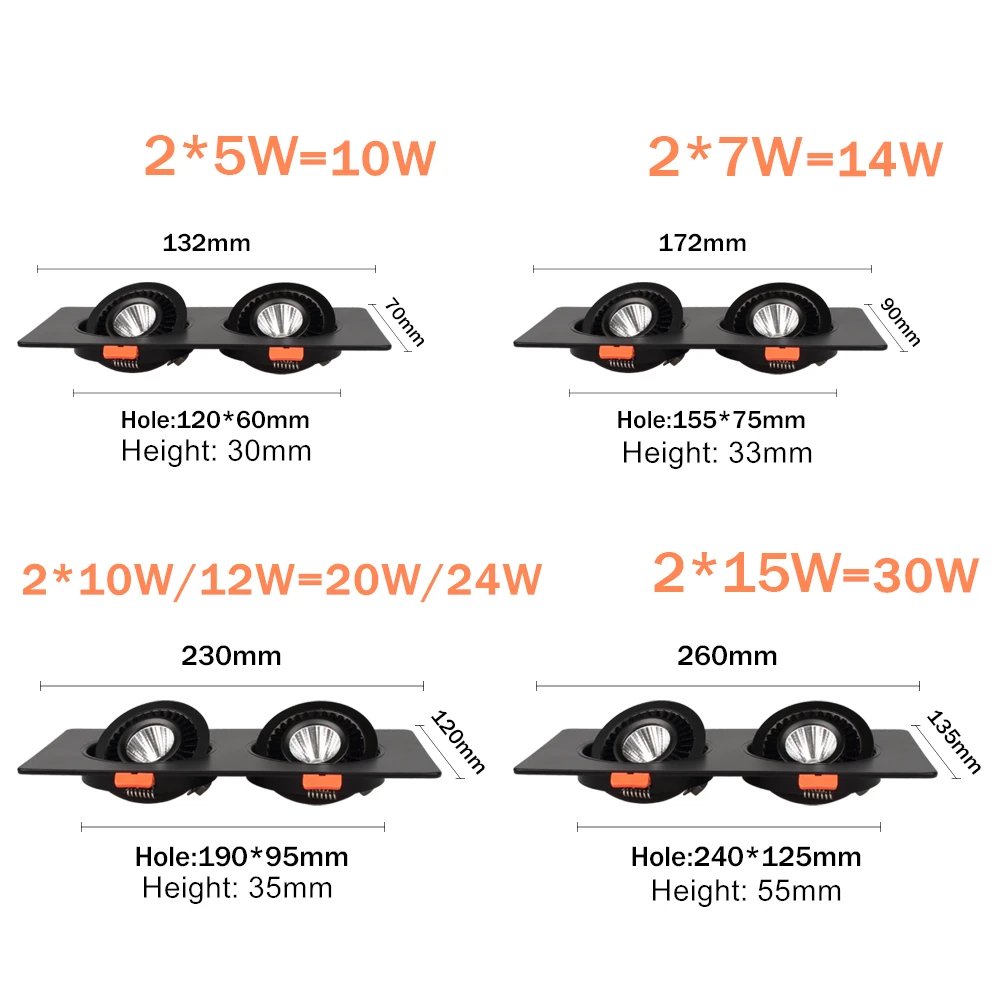 DBF приглушаемый светильник с двойными головками s светодиодный точечный потолочный светильник, встроенный угловой Светильник направленного света 10 Вт 14 Вт 20 Вт 24 Вт, прямоугольный Светильник направленного света AC85-265V