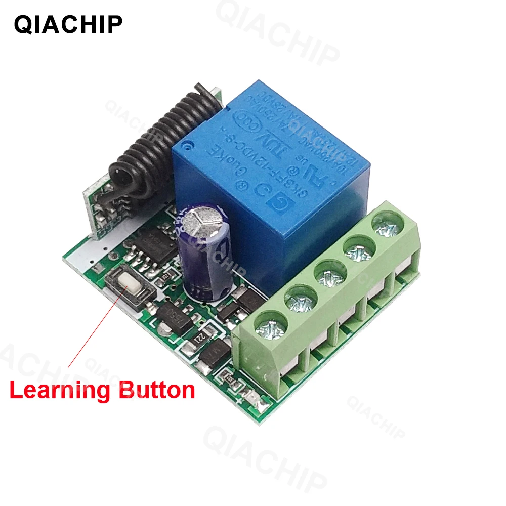 Примечание: для режима блокировки, чтобы узнать больше пультов дистанционного управления, вам нужно две разные кнопки, первая кнопка для «ON», вторая кнопка для «OFF».Например: Кнопка A = ON, кнопка B = OFF.Нажимайте клавишу обучения на приемнике 3 раза, запускайте режим блокировки обучения.Просто подождите, пока светодиодный индикатор на плате приемника начнет мигать и включится.Нажмите кнопку дистанционного управления A. Светодиодный индикатор мигает 5 раз.Нажмите кнопку дистанционного управления B. Светодиод мигает 5 раз.Через 3 секунды светодиодный индикатор снова отключается и успешно учится.A = ON , B = OFF.