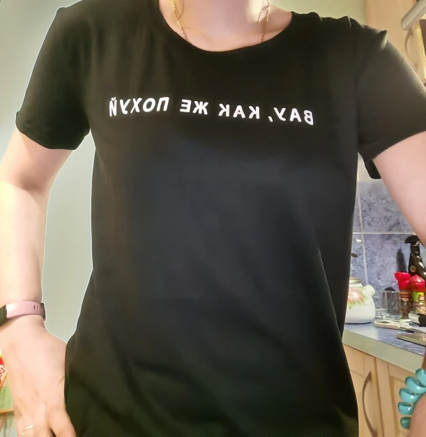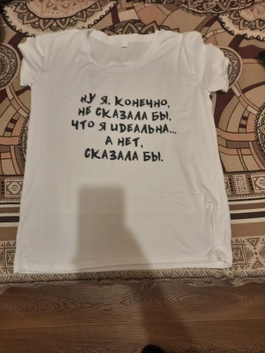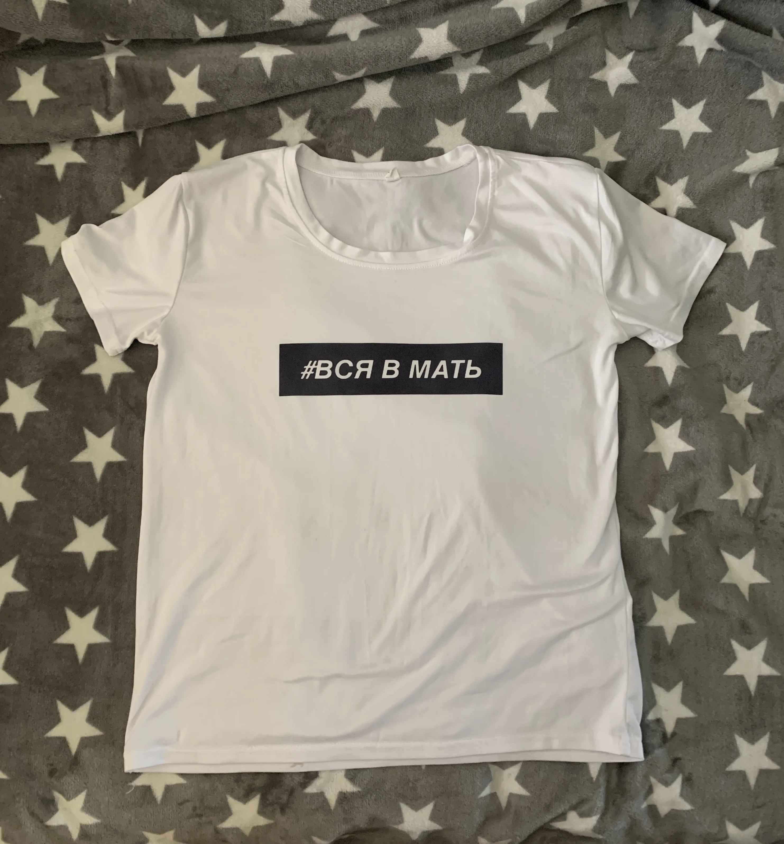Качество вау. Не ожидала от футболки за 300 рублей. Надпись хорошая, выглядит надежно. Размер в размер
