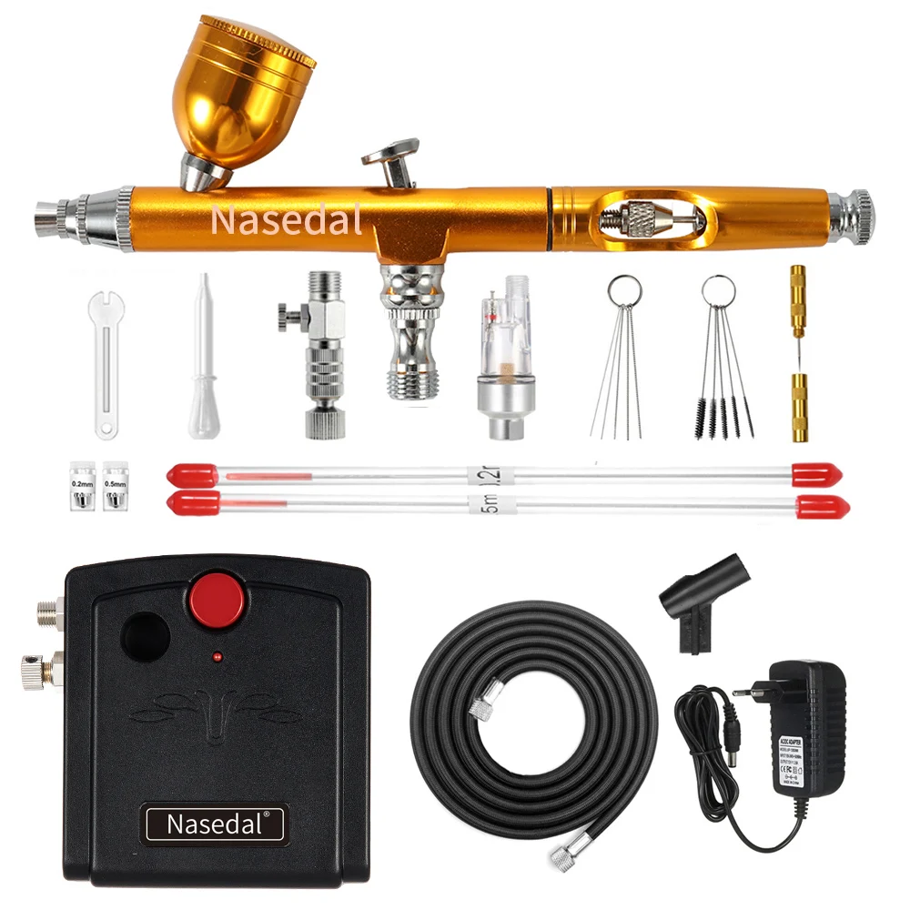 Аэрограф Nasedal, набор с компрессором двойного действия, 0,3 мм, распылитель краски, макияж, ногтей, татуировка, рисование, украшение для автомобиля, торта