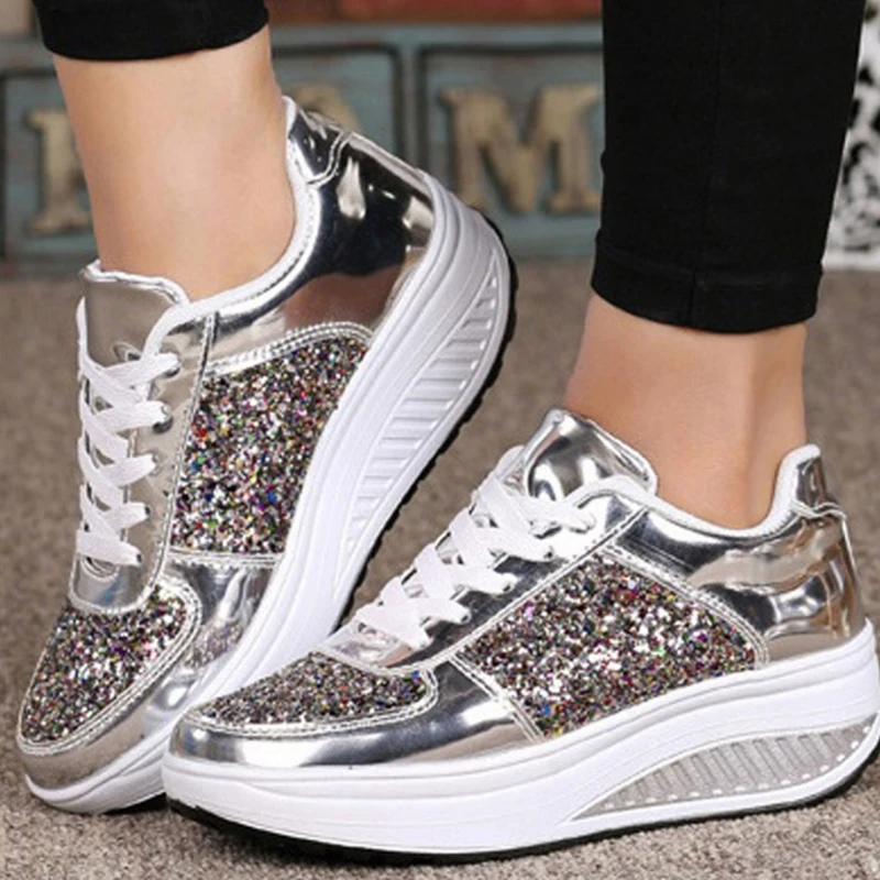 Женские кроссовки на танкетке, белые, с блестками, 2019