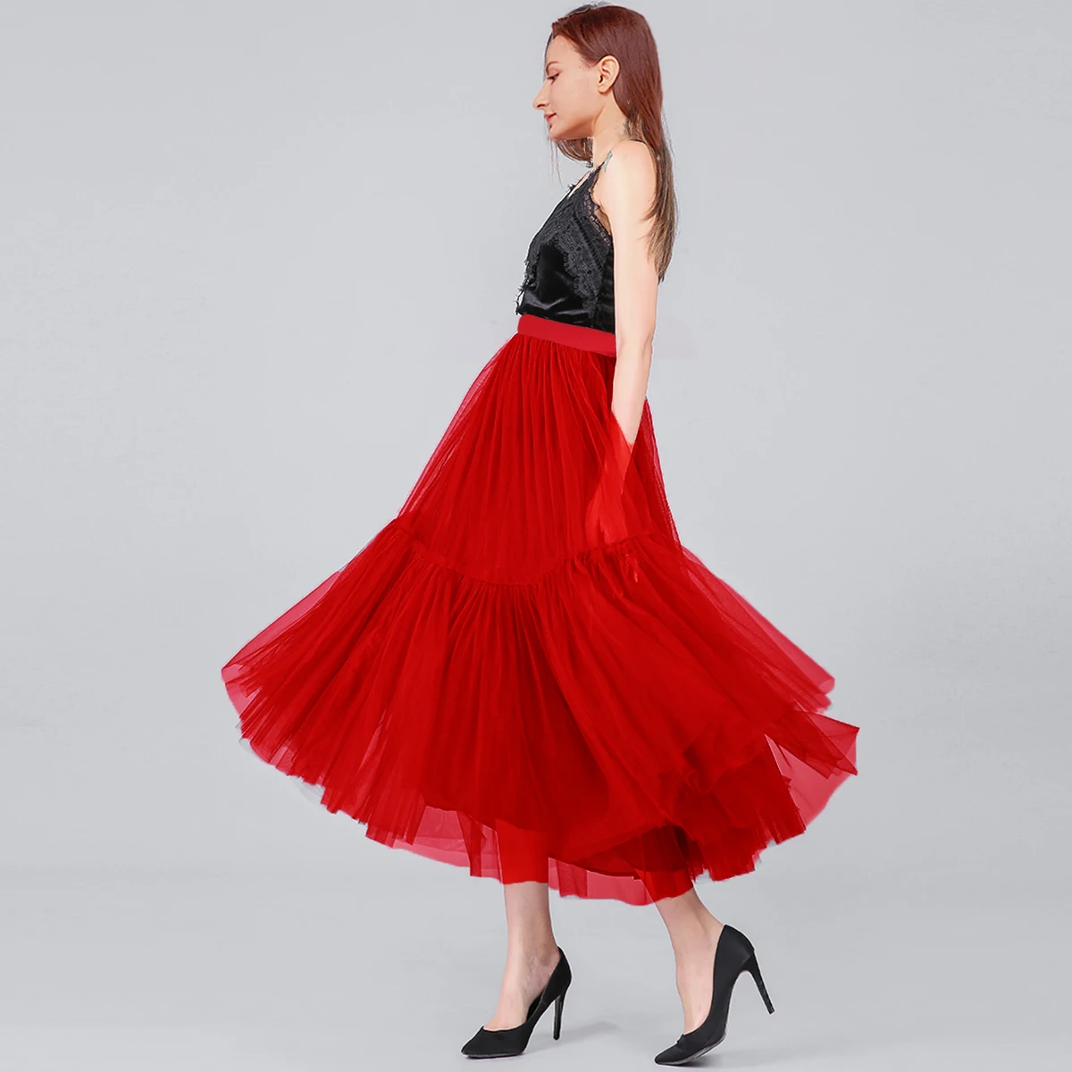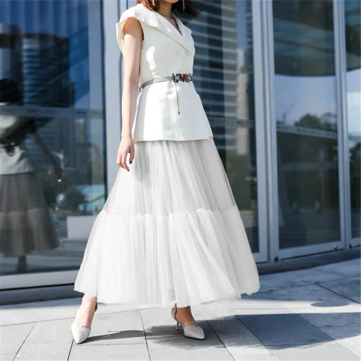 Женская длинная Плиссированная юбка, винтажная подиумная юбка макси, 90 см, мягкая юбка из фатина