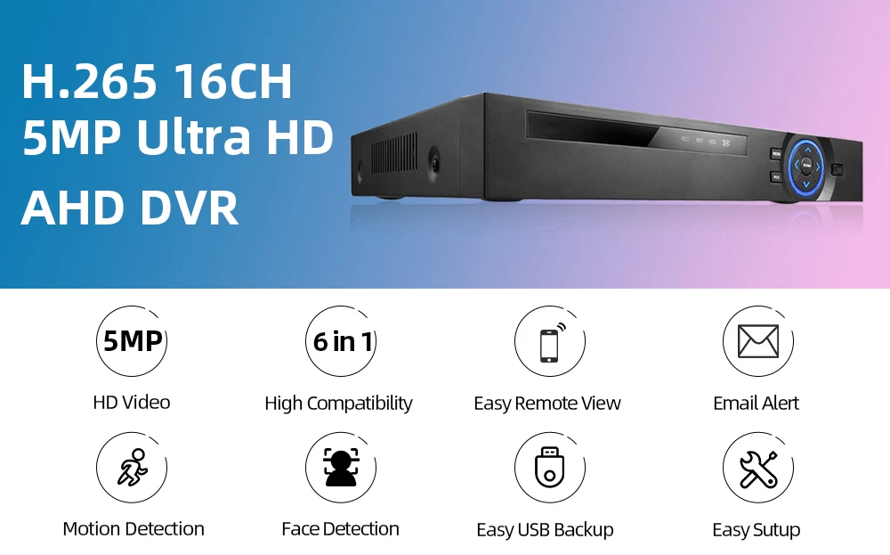 1.H.265 16CH AHD цифровой видеорегистратор;2, Ультра HD 5 Мп дисплей высокой четкости, расширенное H.265 Сжатие видео;3. Поддержка CVBS,AHD,TVI,CVI ,XVI,IP ,6 в 1 Гибридный вход;4. Поддержка распознавания лиц, записи лиц, воспроизведения лиц;5. Поддержка выхода VGA, аудиовхода и аудиовыхода;6. Поддержка режима ночного видения Ultra HD;7. Поддержка 3,5 "дюймовый жесткий диск;8. Поддержка обнаружения движения, оповещения по электронной почте, воспроизведения видео и многоязычности;9. Поддержка Android,Iphone,Ipad,PC,VMS,P2P view;10. Поддержка Plug and Play, простота установки;11. Удаленный доступ в любом месте, в любое время;