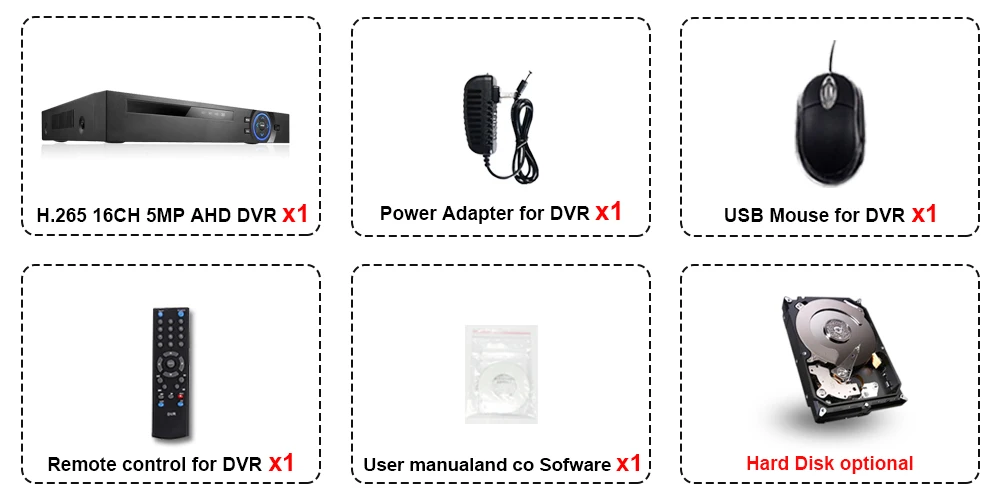 1 х H.265 16CH 5.0MP 6 в 1 AHD DVR гибридный цифровой видеорегистратор1 x Блок питания для DVR1 х USB мышь для DVR1 X CD программное обеспечение для DVR1 X пульт дистанционного управления для DVRЖесткий диск опционально!