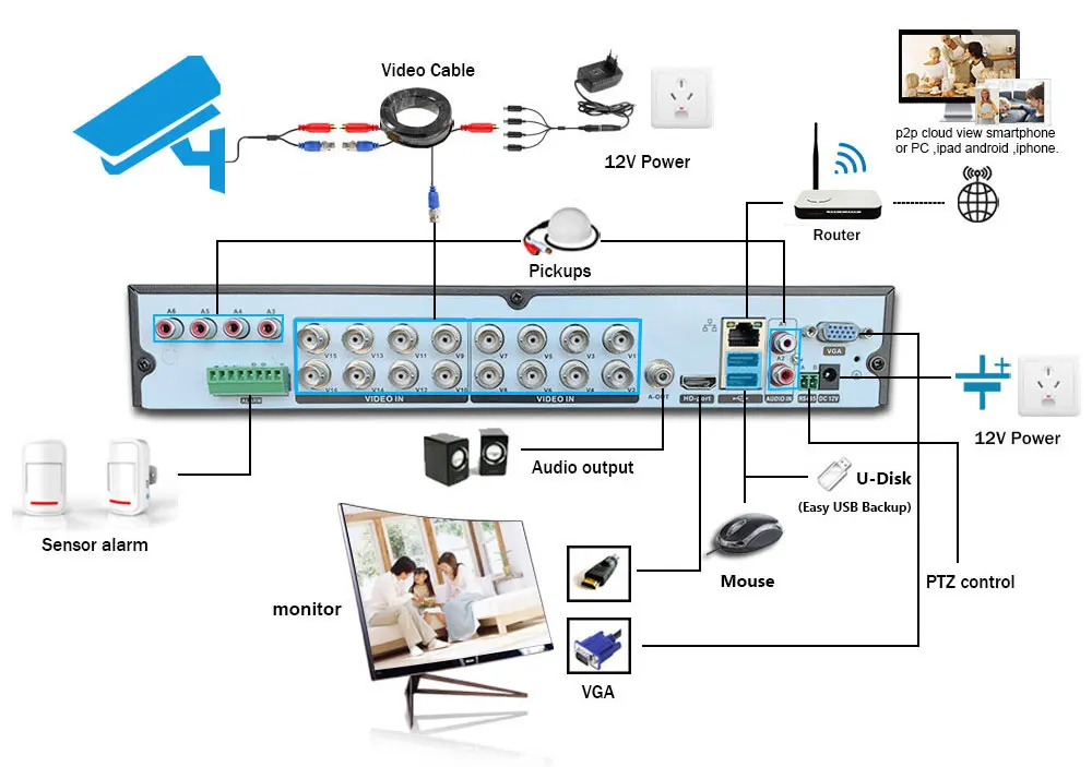 Простая настройка, всего 4 шага для просмотра мобильный телефон, просмотра видео в режиме реального времени из любого места и в любое время с помощью смартфона, стола или ПК с передовой технологией P2P, вы можете получить удаленный доступ к вашей системе за считанные минуты или меньше, нет необходимости в переадресации, удаленный доступ никогда не был таким простым!