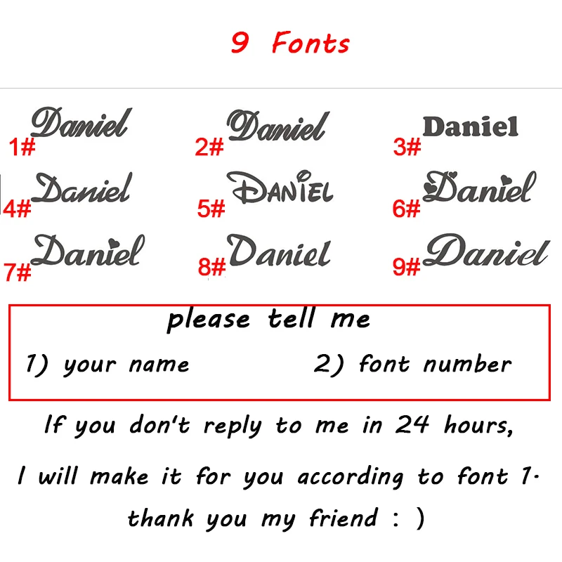 После оплаты свяжитесь с продавцом и отправьте сообщение с информацией, которую вы хотите, чтобы сказать имя и шрифт, который он ответит вам менее чем за 24 часа