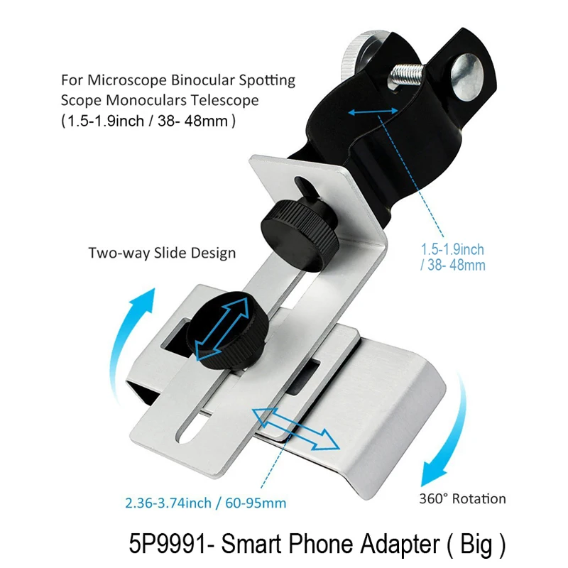 # 5P9991-CellPhone адаптер: Если диаметр окуляра от 38 до 48 мм, можно использовать егоРегулируемый диапазон: подходит для большинства сотовых телефонов, ширина которых от 60 до 95 мм; Продольная Длина: от 0 до 63 мм; Поперечная Длина: от 60 до 95 ммДержатель телефона с поворотом на 360 градусов: обеспечивает максимальный регулируемый диапазонПрочные металлические материалы: Универсальные и прочные; Одноразовая покупка для длительного использованияЗажим для мобильного телефона с резиновой подкладкой: не беспокойтесь о том, что ваш телефон поцарапан или поврежденЦвет: черный, серебристыйВес: 87 г, 3,07 унций