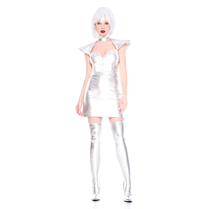 Пространства Серебряный боди Женский костюм на Хеллоуин костюм космонавта серебро костюмы пилотов Косплэй Карнавальная фантазия вечерние платье наряд