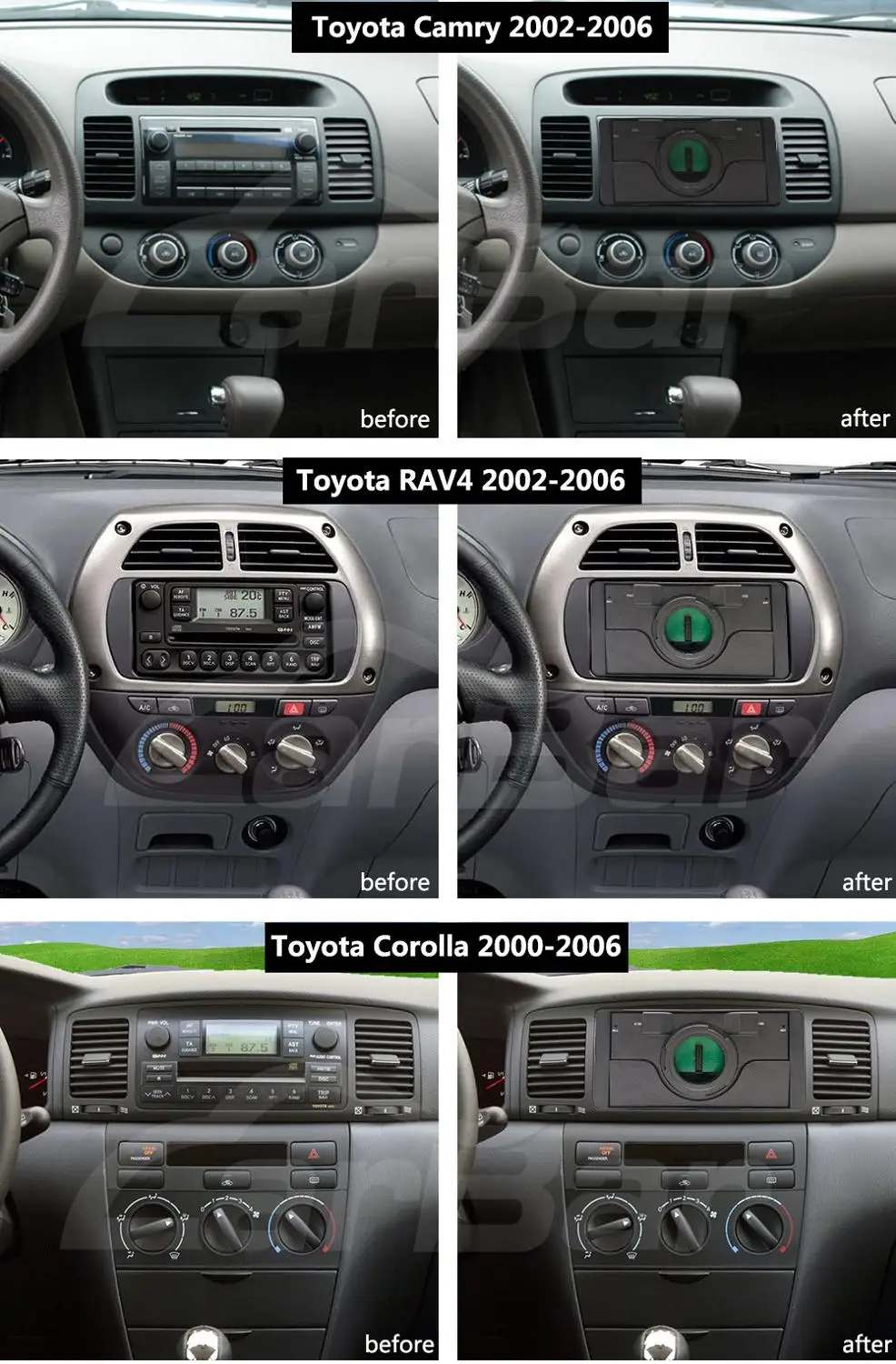 RAV4 2001-2006 Prado 1996-2006 Vios 2003-2010 Hilux 2001-2011 Vitz/Avanza 2003-2010 Land Cruiser 1998-2006 FJ Cruiser 2003-2010 RunX 2003-2003 Previa 2006-2011 Estima 2006-2011 Тундра 2003-2006 Камри 2002-2006 Daihatsu Be-go 2006-2012 Fortuner 2008-2011 Perodua Nautica 2006-2012 Alphard 2008-2015 Corolla 2000-2006 Terios 2006-2010 4runner 2002-2009 Sequoia 2003-2007 Tarago 2006-2011 Echo 2000-2005 Soluna Vios 2003-2007 Rush 2006-2012 Innova MR2 Kluger Hiace Crown Allion Auris Hiace Celica Highlander Yaris и т. Д. Примечание: Список совместимости только для справки, пожалуйста, подтвердите форму и размер центральной консоли перед покупкой, этот блок подходит для оригинальной радиопанели размером 205 мм (Ш) * 103 мм (В) Конечно, у нас также есть другая нестандартная рама для автомобиля toyota, сделанная в последние годы, клиенту нужно только отправить нам вашу приборную панель для подтверждения, тогда мы проверим, есть ли у нас подходящая рама для вашего автомобиля.