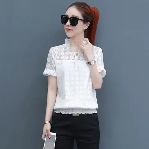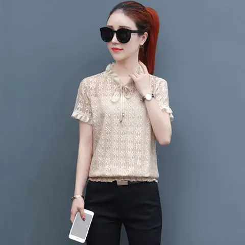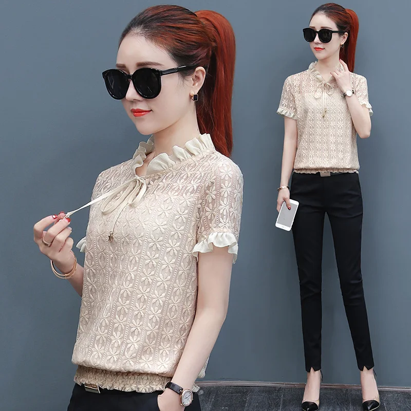 Женские весенне-Летние Стильные кружевные женские блузки рубашки, повседневные блузы с коротким рукавом и воротником-стойкой, бежевые и белые кружевные топы DF2640