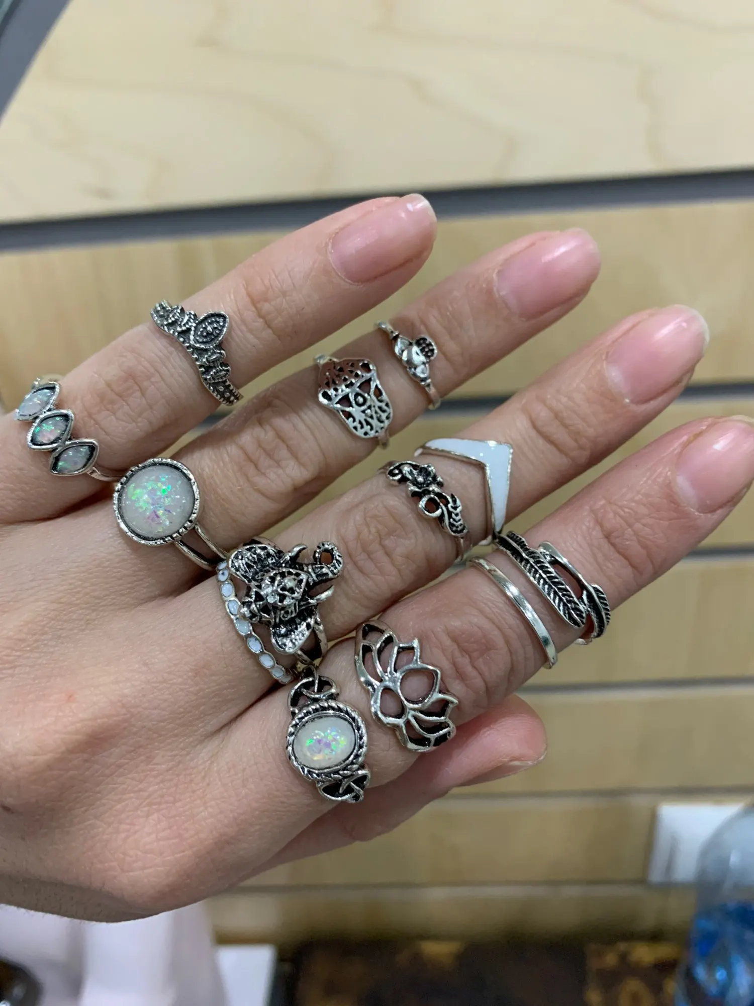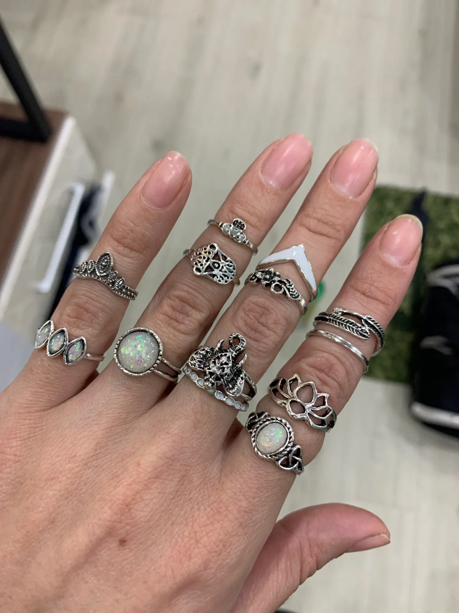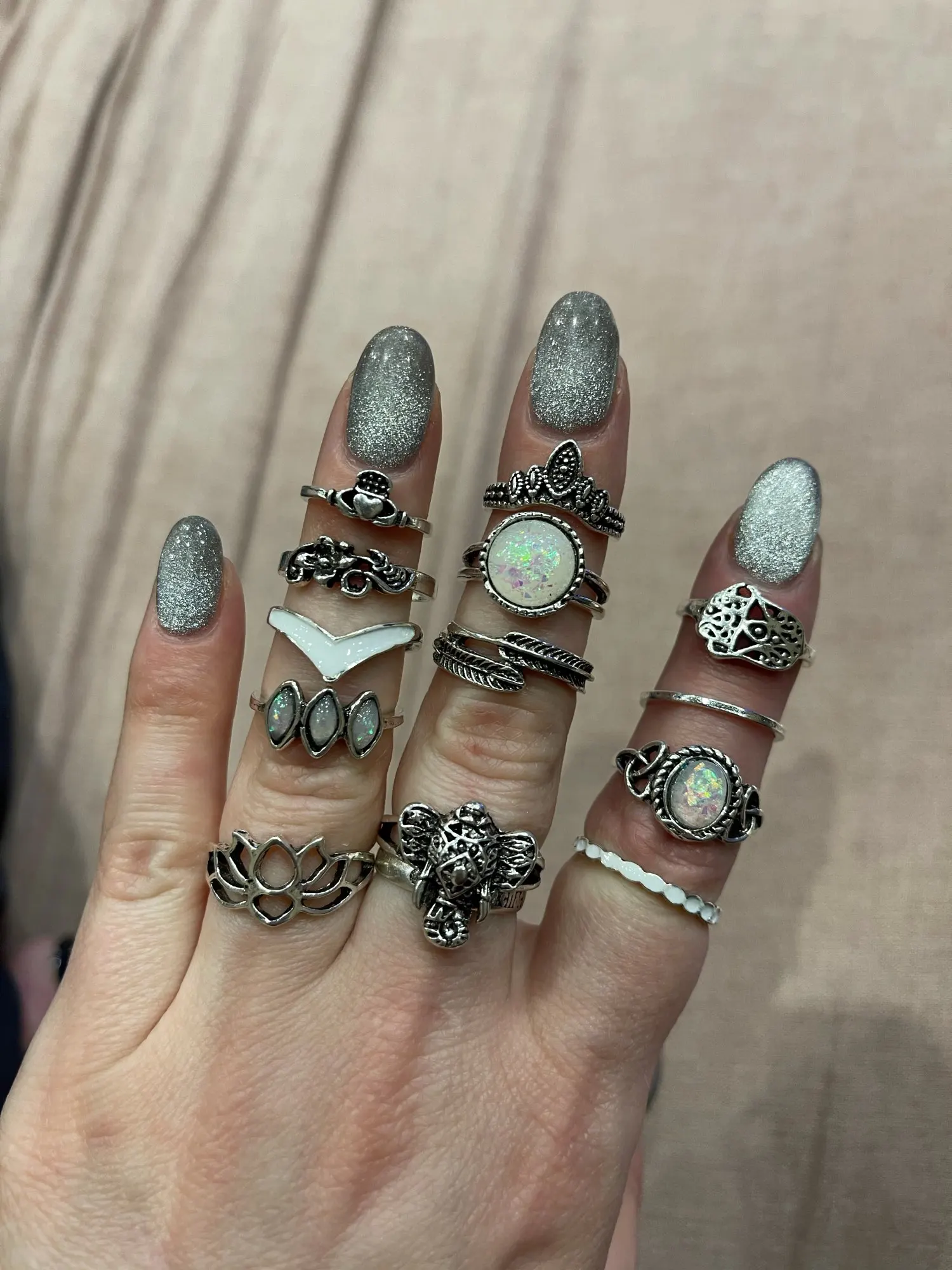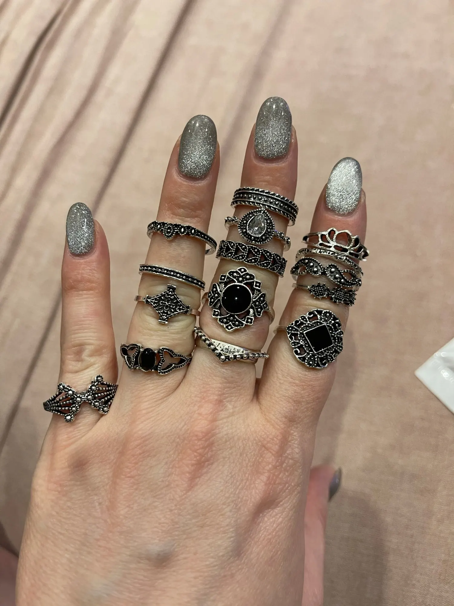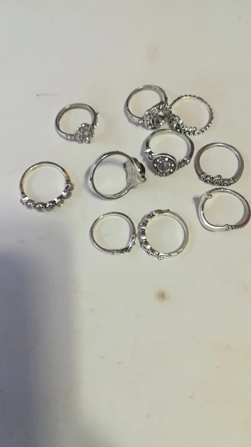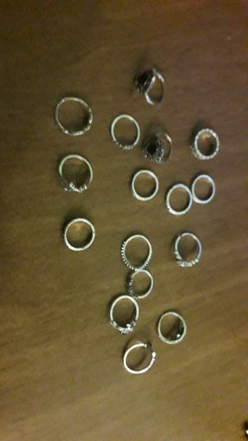 Набор из 15 колец, разного размера и толщины. Кольца под серебро, по крайней мере можно подумать, что так и есть. Хватит на все пальчики, можно чередовать!! Продавца рекомендую!!