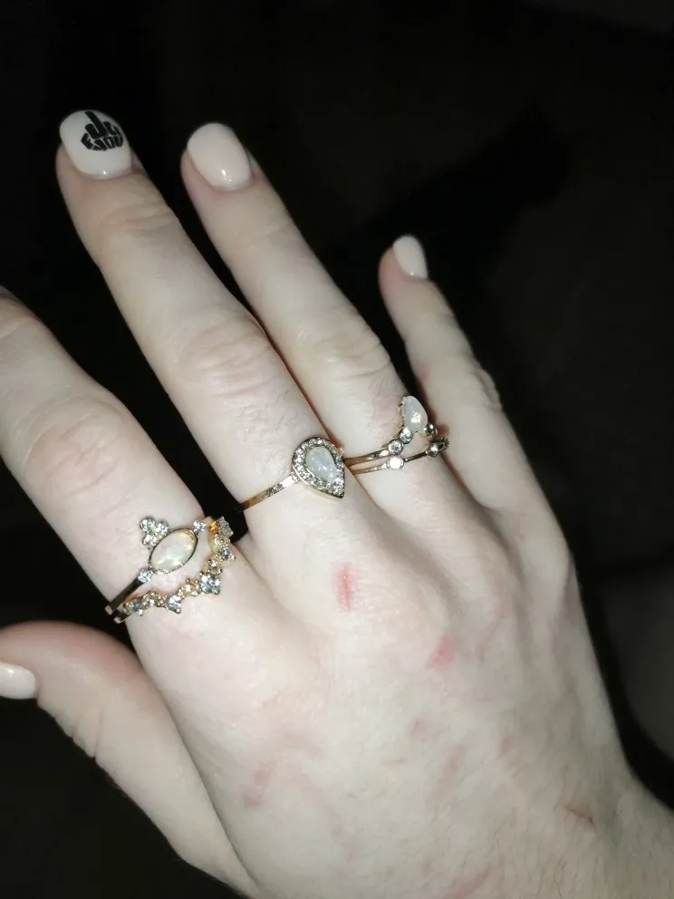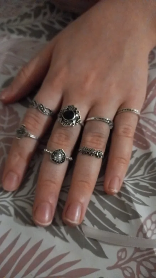 Кольца пришли быстро - буквально за две недели с учетом новогодних праздников в МО. Попыталась одеть все так, как в описании на фото - видны некоторые отличия от заявленного, размер тоже «гуляет». Для меня это не критично - брала для фото маникюра клиентов.