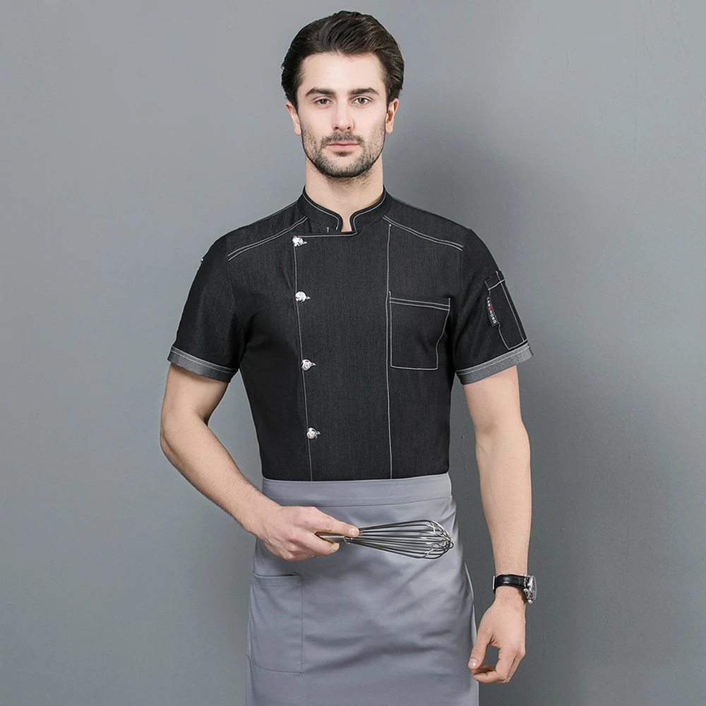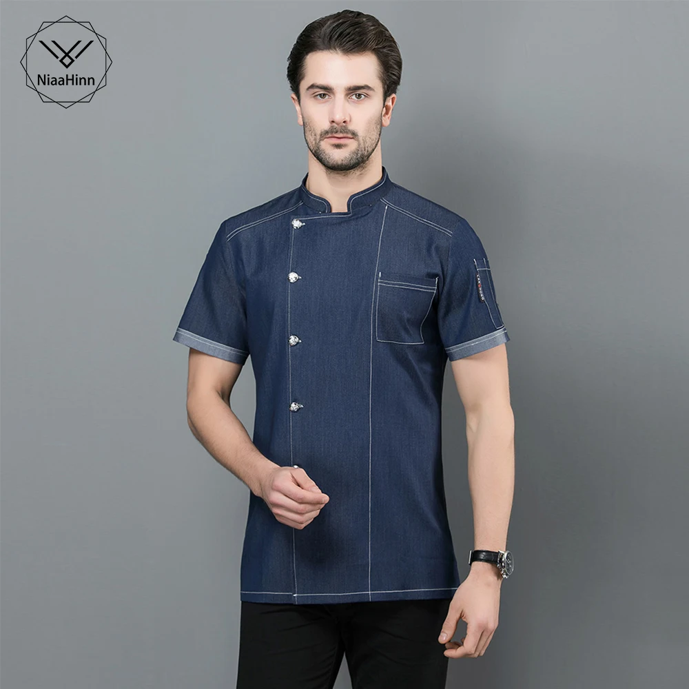 Новая джинсовая синяя форма шеф-повара для кухни, пекарни, кафе, общественного питания, дышащая форма с коротким рукавом, рубашки, куртка официанта