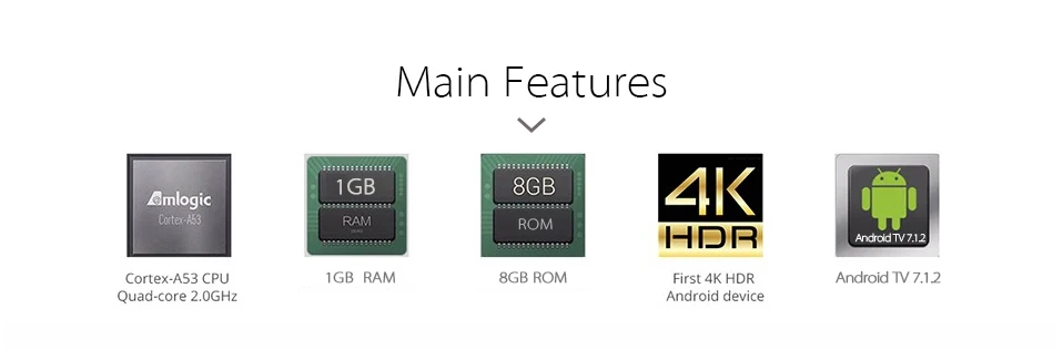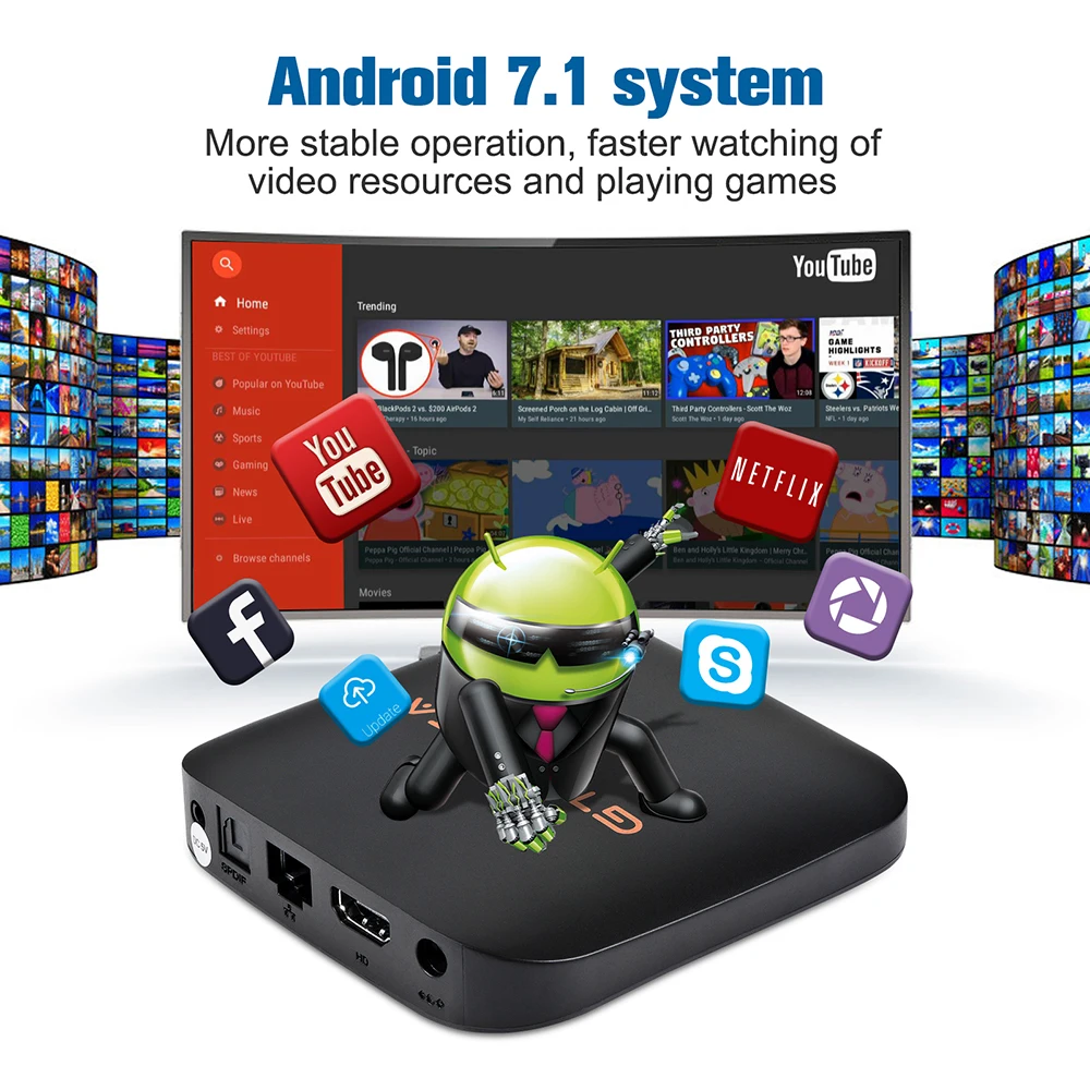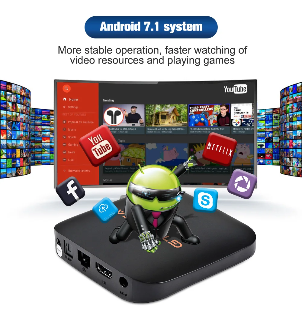 1, Android 7.1.2 TV BOX2. ТВ-центр (KODI17.3)3, 4K 30fps/HEVC H.265/1080P/MPEG-4 фильмы поддерживаются.4, Amlogic S905W 1GBRAM + 8GBROM5, встроенный Wifi 2,4G, 802.1.1b/g/n6. Skype Чат, Picasa, Youtube, мерцание, Facebook, онлайн фильмы и т. Д.
