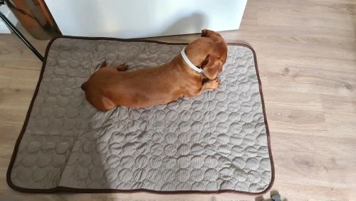 Счастливый и свежий Пинчер .... Он падает туда, чтобы быть свежим, затем падает в кровать, дает ему тепло и возвращается сюда... Я обязательно куплю еще один больше, и положить его противоскользящим внизу, потому что он скользит