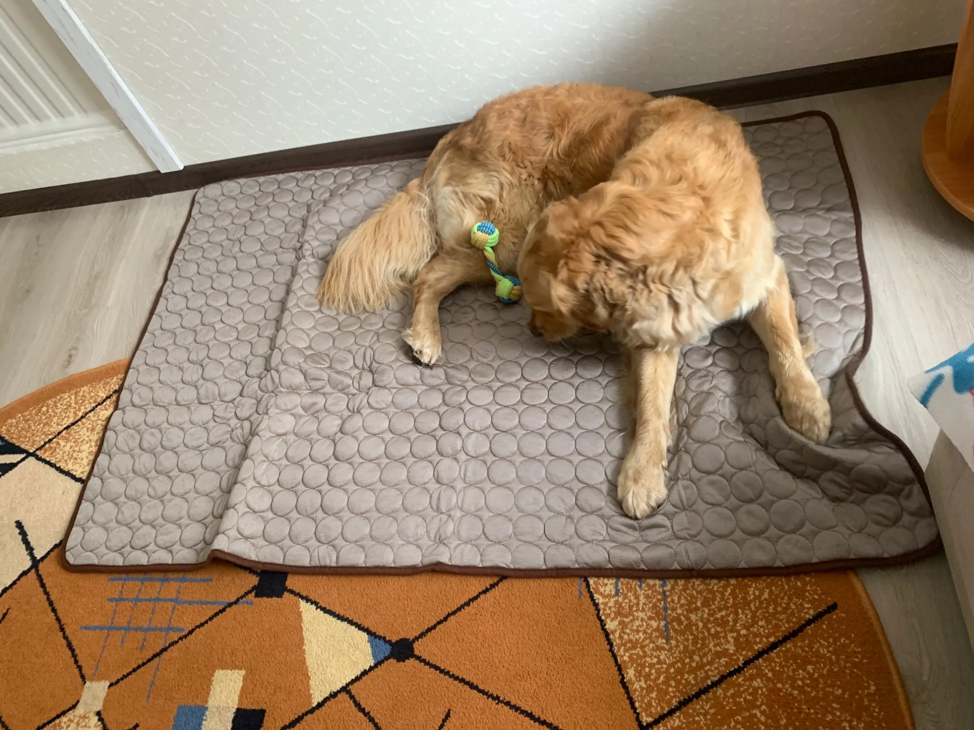 Замовила 25.06, забрала з відділення НП/Київ 11.07. Товар їхав трішки більше 2-х тижнів. Для голдена вагою 30 кг місця багато)). На дотик килимок прохолодний. Але коли лежиш на ньому, то він нагрівається від тепла тіла, як і будь-який інший. Виготовлений якісно, без запаха. Відправили дуже швидко.