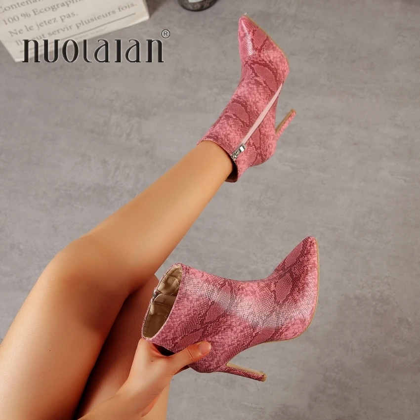 Женские ботильоны на высоком каблуке, обувь с острым носком, модные праздничные ботинки, привлекательная женская обувь со змеиным принтом, осень 2019