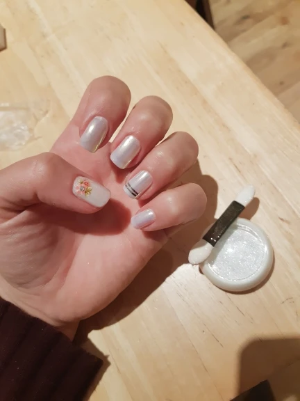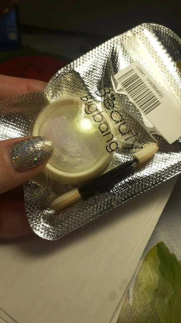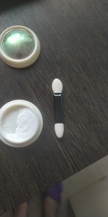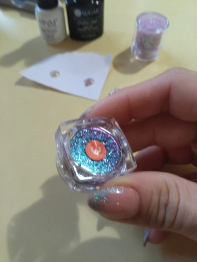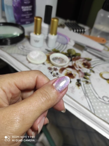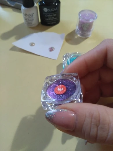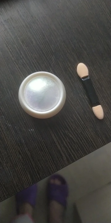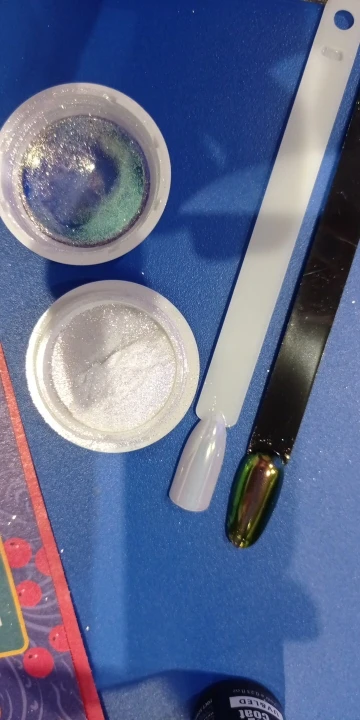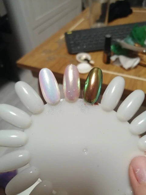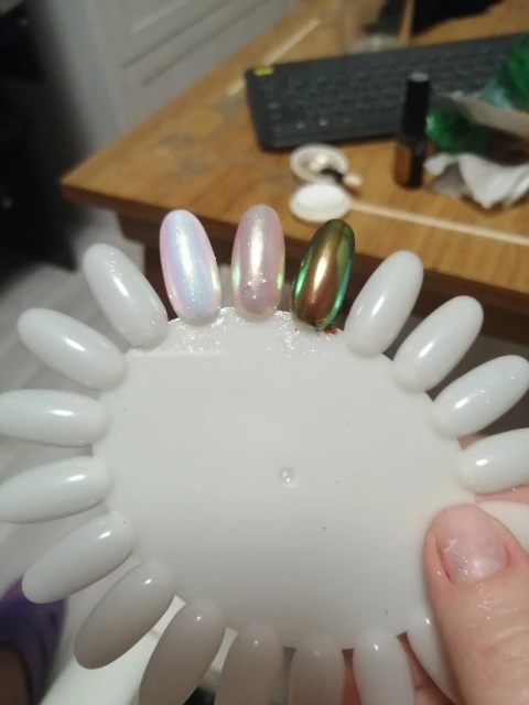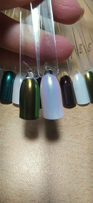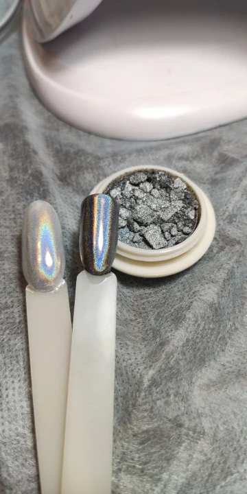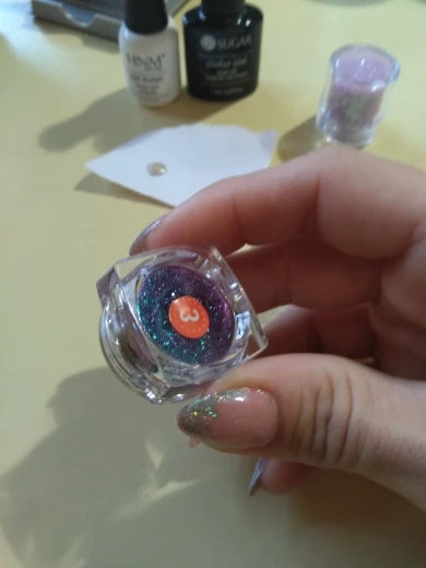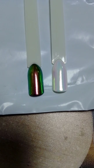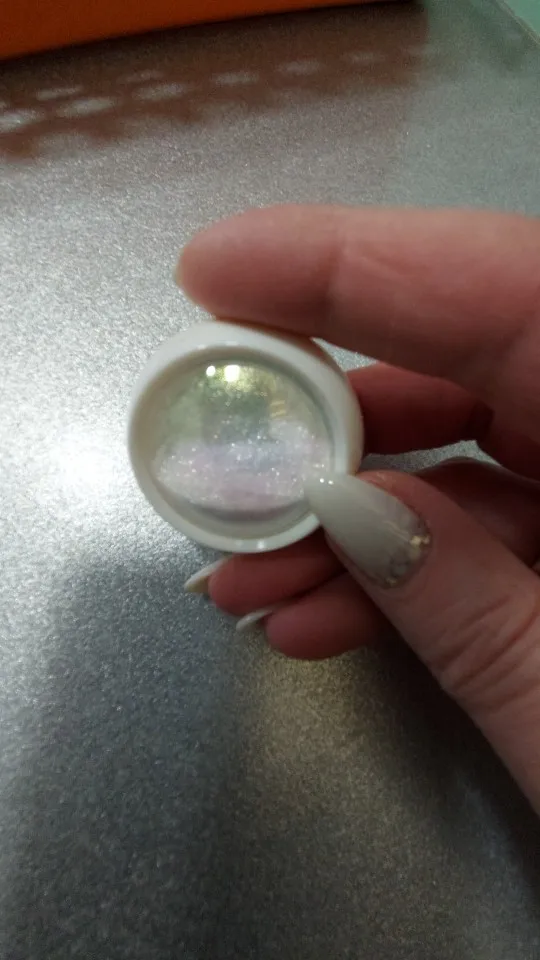 Пришла в течении двух месяцев. Красивая втирка. В коробочке насыпано совсем мало. Расходуется экономно. На темных лаках даёт металлический эффект. ( последнее фото). Отливает розовым и зеленым. Буду заказывать ещё.