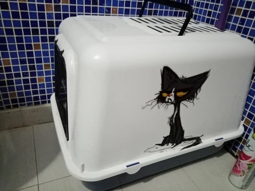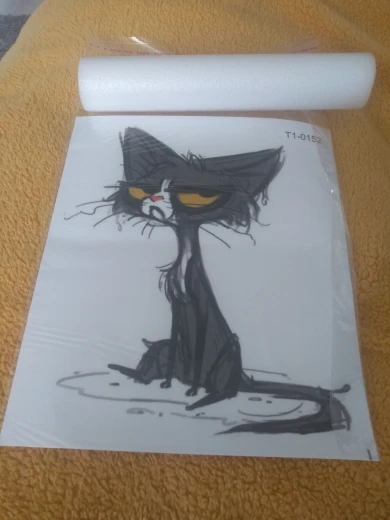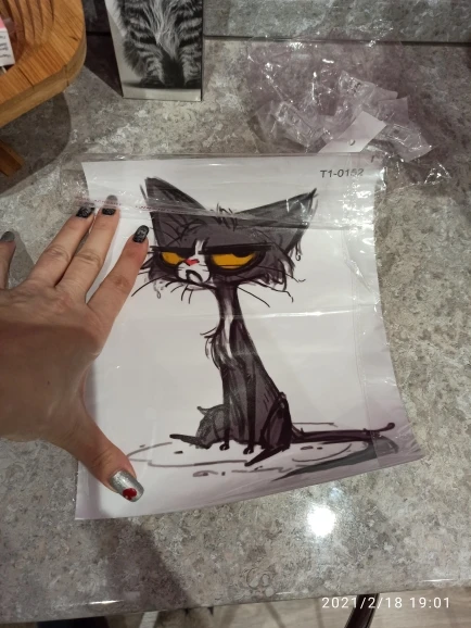 Хорошая наклейка. Очень напоминает мою кошку, когда она обиделась или в туалете. Специально заказала для кошачьего туалета. Подошла по размеру. Замотана была на пенопластовую тубу чтобы не попортилась в дороге. Посылка объединилась с другими посылками и пришла за 2 недели.