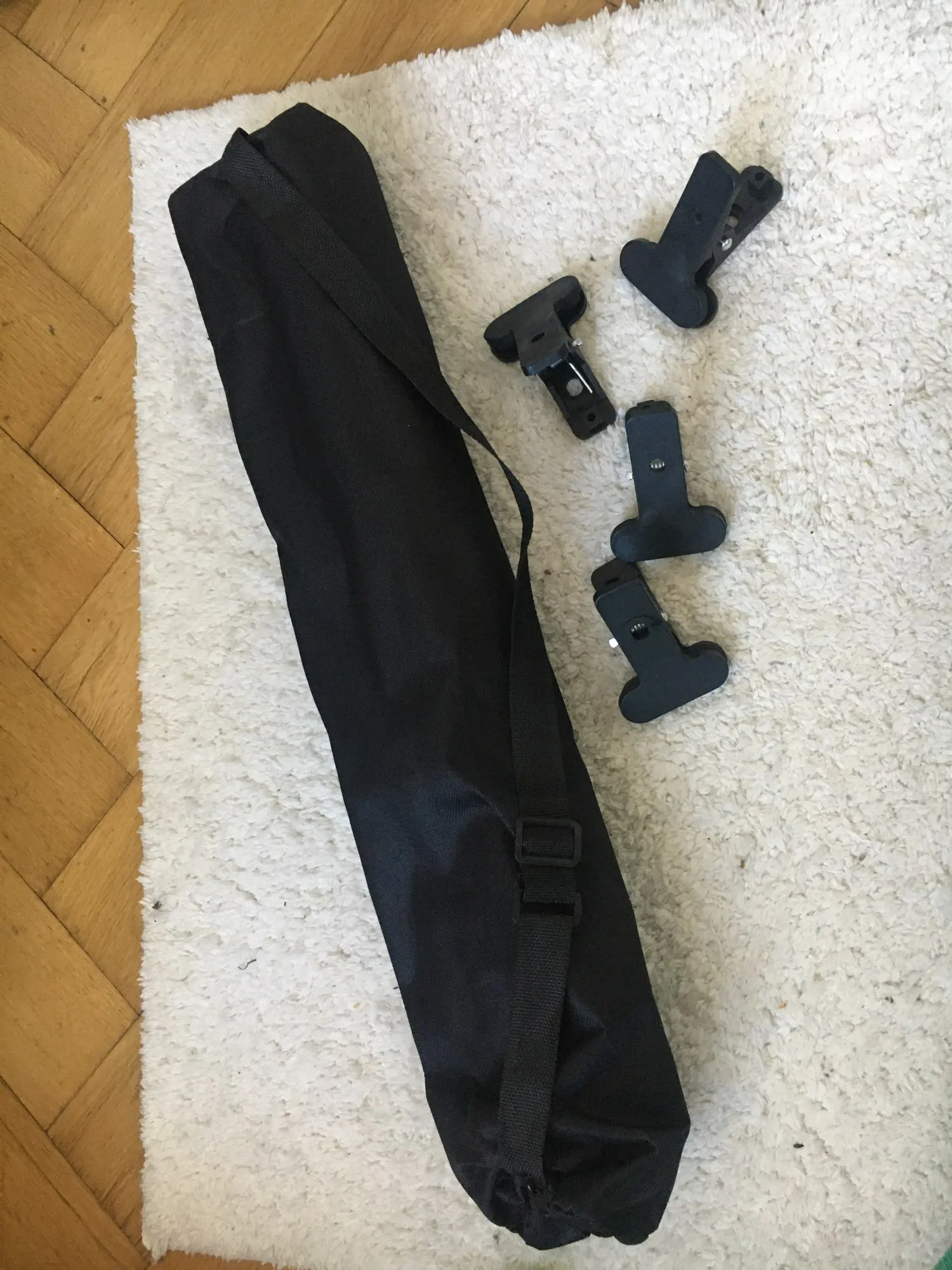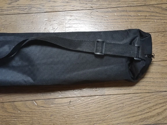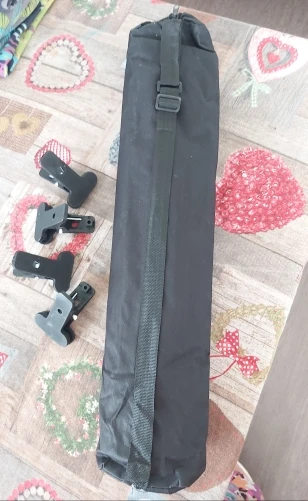 Идеальный, хороший материал. Поставляется с сумкой для переноски и двумя зажимами