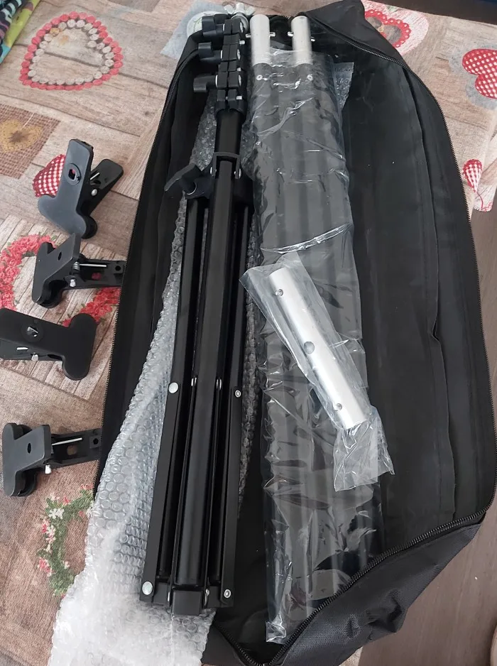 Сначала заказал 150х200, но за доплату в 2 доллара предложили приобрести 200х200. Согласился. Доставили очень быстро. Товар соответствует описанию. Понравилось: - наличие сумки-чехла в комплекте - то, что поперечину можно собрать не полностью на 200 см, а частично, для узкого фона или отражателя