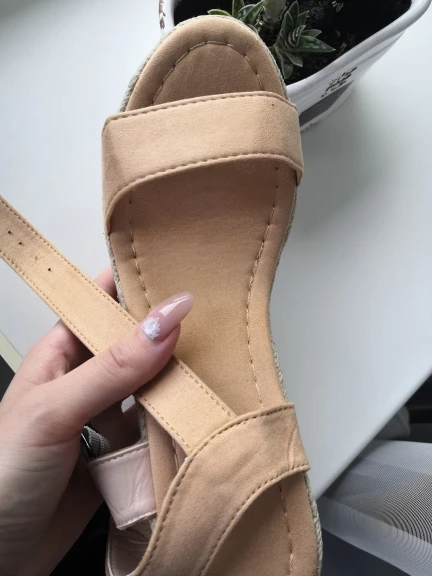 Доставка до Москвы 2 недели. Босоножки на фото продавца лучше выглядят. Размерная сетка соответствует, сделаны качественно, клей нигде не торчит, запаха нет, но выглядят дёшего, материал странный. У меня широкая нога, но даже на мне болтаются.