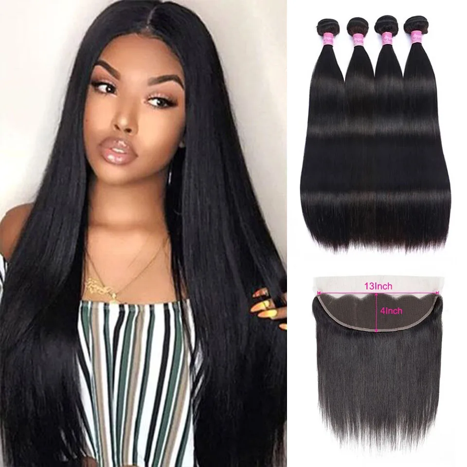 Прямые волосы пряди с кружевом лобовой (4 + 1), Королева бразильского Волосы Remy 100% человеческие волосы 4 пряди с кружевом фронтальной 8-26L