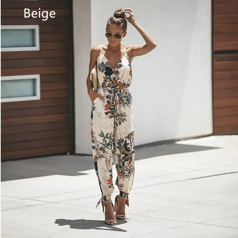 Женский комбинезон в стиле бохо, повседневный комбинезон без рукавов, с V-образным вырезом, с цветочным рисунком, широкие брюки, свободные длинные брюки, лето 2019