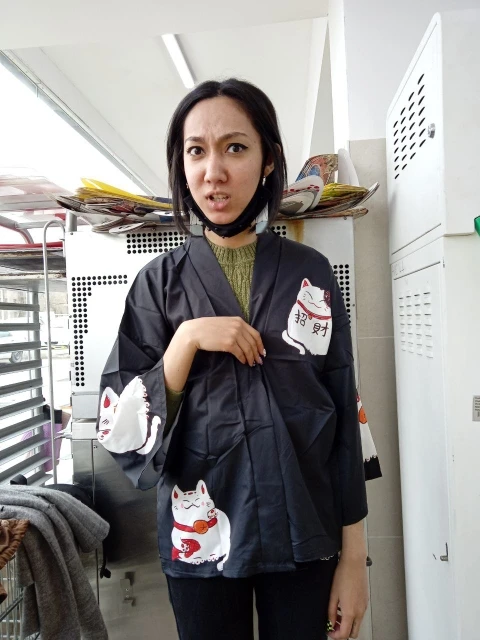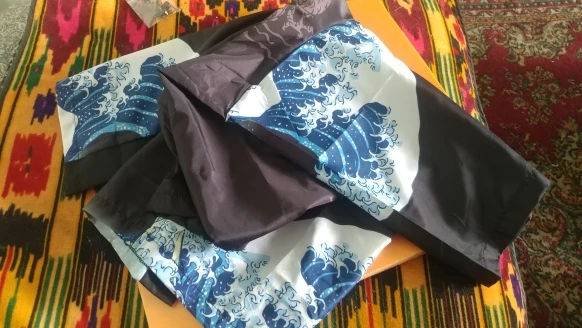 выбирая это кимоно, читала отзывы. Кто-то написал, что замечательная ткань... ткань напоминает материал для зонтов - плотная, тонкая и грубая. к телу неприятно, как в пластик завернуться. сшито довольно аккуратно, нитки из швов не торчат. посмотрим, как будет носиться)