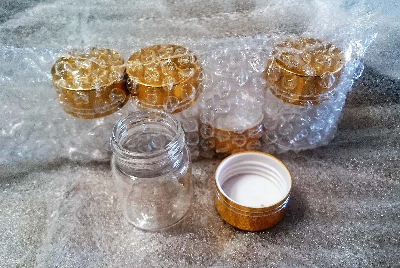 Стеклянные баночки, очень маленькие. Думала будут чуть больше. В целом понравились. Заказ пришёл относительно быстро.