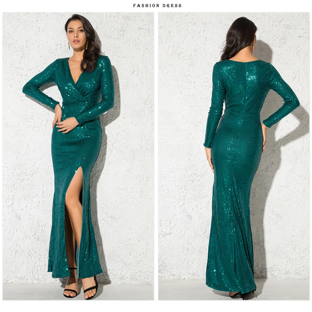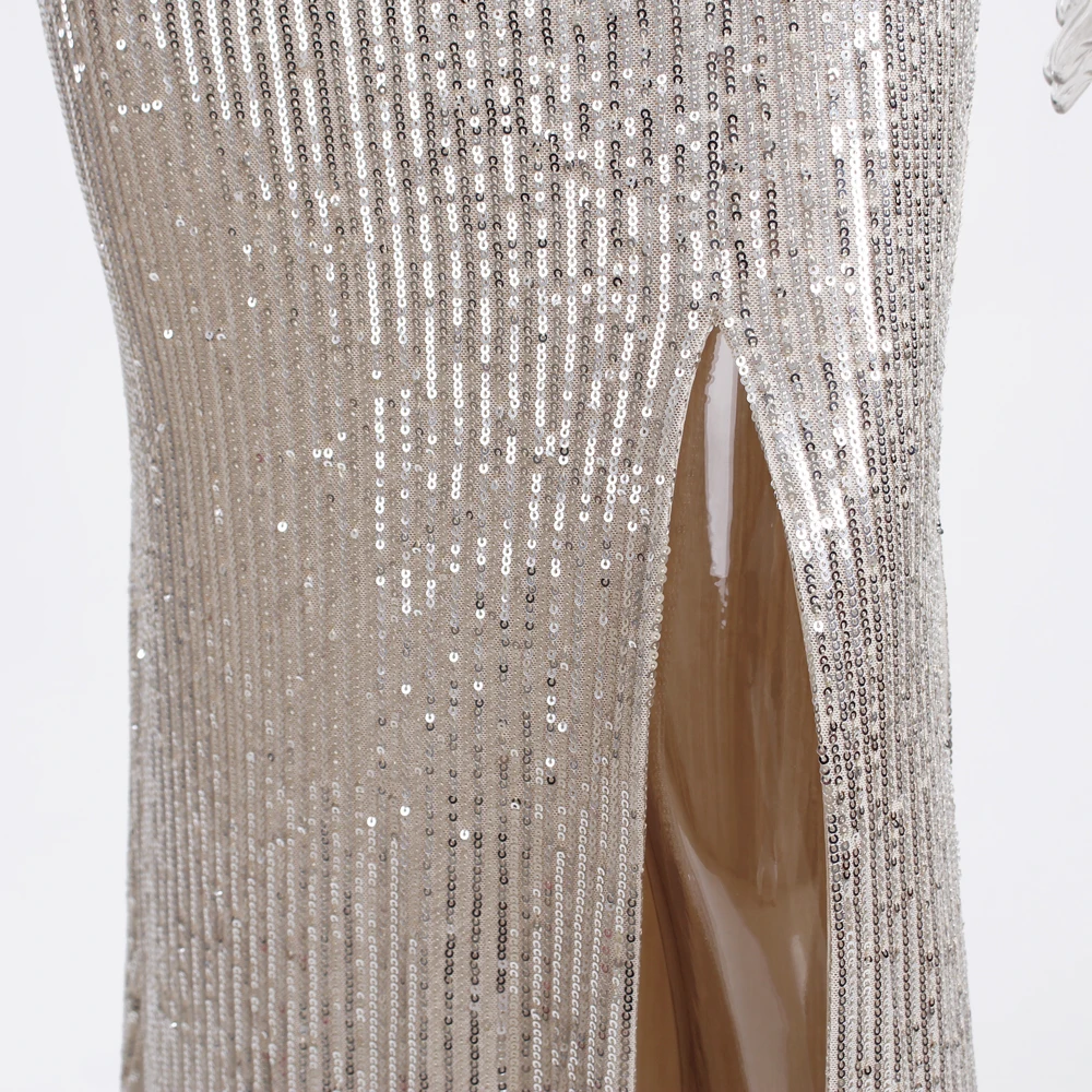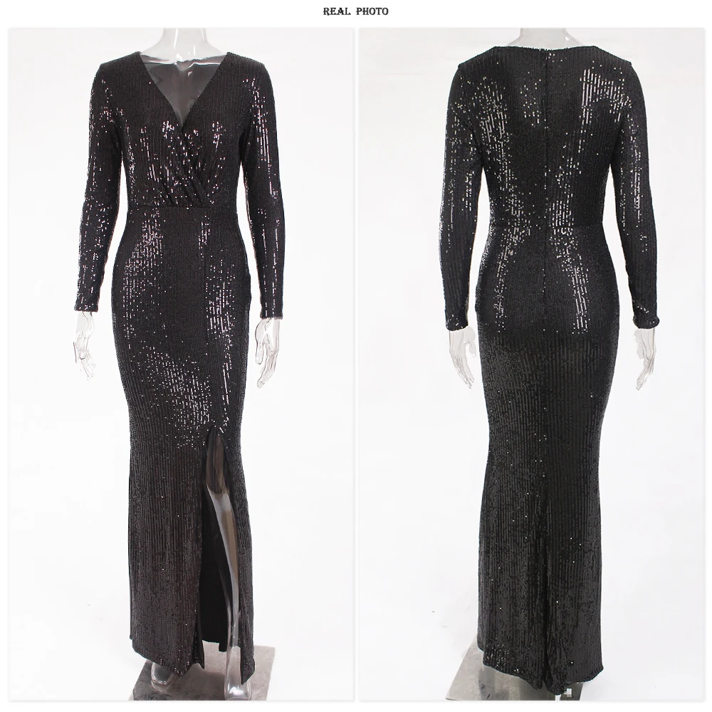 Серебристое платье-макси с длинными рукавами, V-образным вырезом, блестками и разрезом на ногах